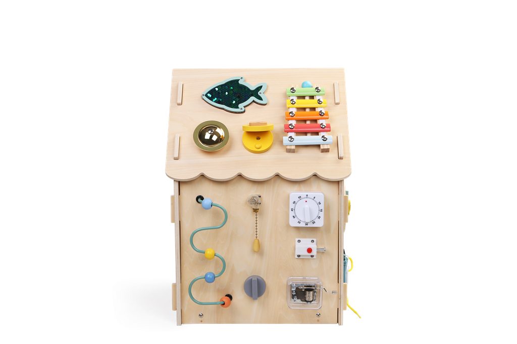 Objevte svět zábavy a učení s dřevěným domečkem se spoustou aktivit! Každá strana nabízí množství interaktivních prvků, které děti zabaví a zároveň podpoří rozvoj jemné motoriky, logického myšlení i smyslového vnímání. Děti mohou otáčet barevným volantem, zkoušet řadicí páku, vést kuličku labyrintem, točit ozubenými kolečky a sledovat, jak do sebe zapadají. Domeček nabízí také počítadlo, otáčecí větrník a závěsná korálková oblaka, které rozvíjejí smyslové vnímání i jemnou motoriku. Nechybí ani trénink praktických dovedností! Děti si mohou zkoušet otevírání a zavírání různých typů zámků, závor a západek, učí se zavázat tkaničky, zapnout zip či knoflík. Procvičují si trpělivost, přesnost i logické myšlení a připravují se tak zábavným způsobem na úkony každodenního života. Domeček je vyroben z kvalitního přírodního dřeva a natřen netoxickými barvami. Všechny hrany jsou hladké a bezpečné pro dětské ruce. Skvělý dárek pro zvídavé děti od 3 let. Hračka podporuje samostatnost, kreativitu a přirozenou touhu objevovat svět kolem sebe. Hlavní vlastnosti: barevný volant a řadicí páka pro trénink koordinace rukouotáčecí ozubená kolečka pro poznávání příčiny a následkurůzné typy zámků a závor pro rozvoj zručnosti a trpělivostipočítadlo a labyrint pro podporu rané matematiky a logikyotočný větrník a závěsné korálky pro zkoumání tvarů a pohybukvalitní a bezpečné provedenívhodné pro děti od 3 let