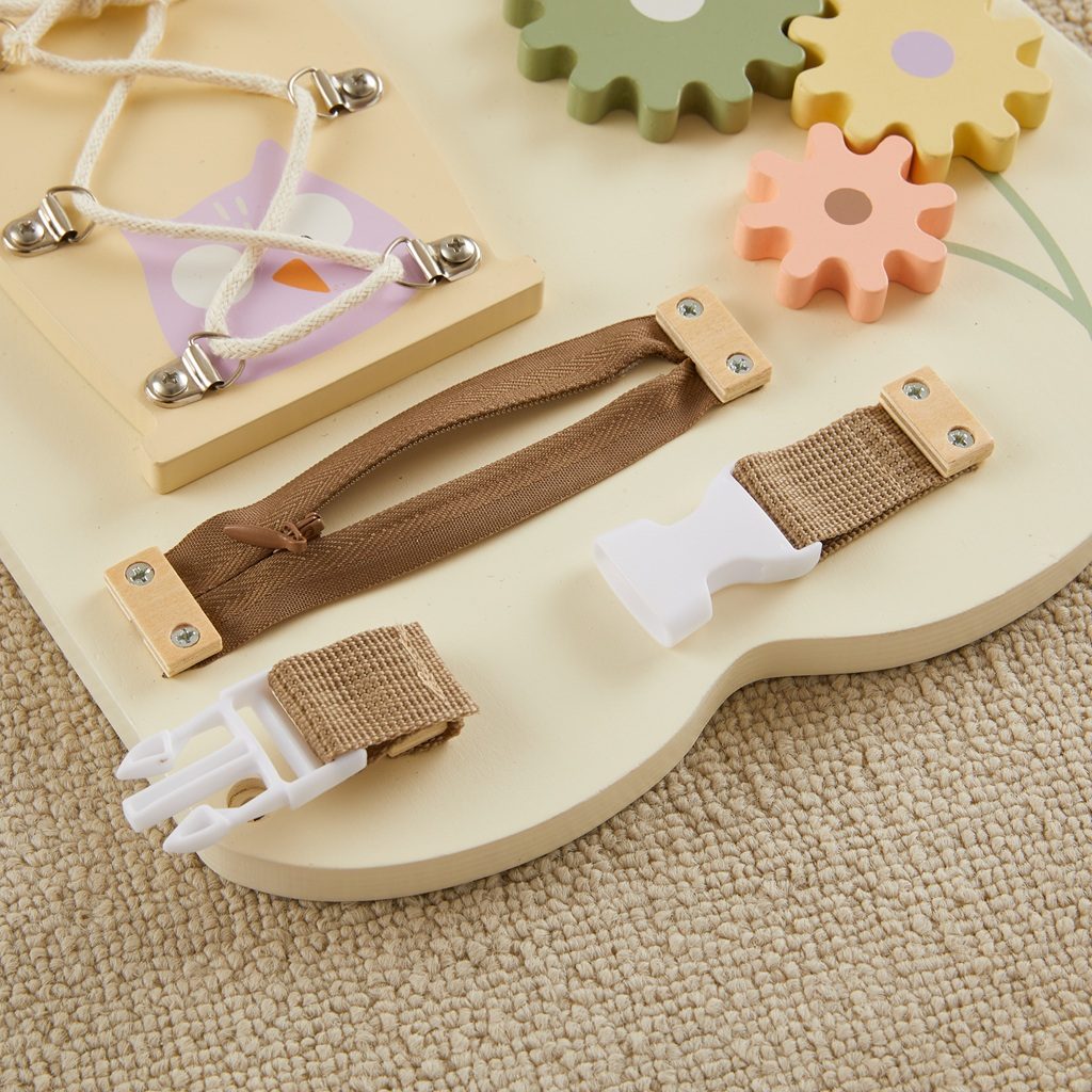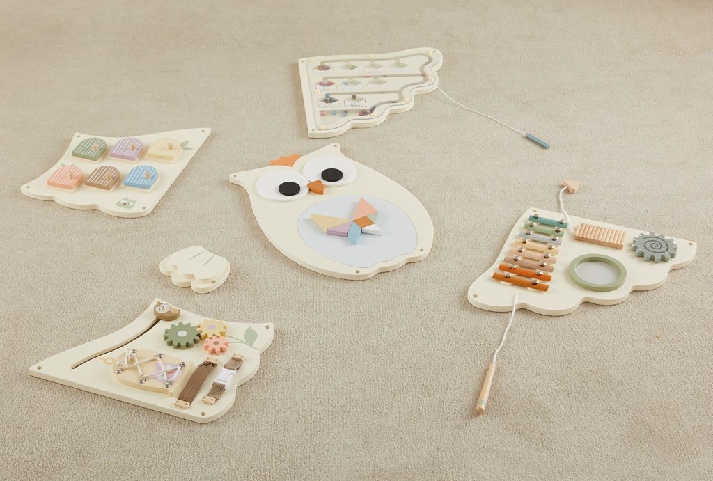 Tato velká dřevěná motorická deska ve tvaru sovy v jemných pastelových barvách zaujme děti už na první pohled. A to nejen svým roztomilým vzhledem, ale hlavně pestrou nabídkou aktivit. Na roztažených křídlech najdou děti více než deset různorodých herních prvků: xylofon, ozubená kolečka, zrcátko, bludiště, posuvné a otevírací prvky, magnetickou tabulku s magnety, dvířka s hmatovým překvapením uvnitř a různě barevné korálky. Všechny tyto detaily děti motivují ke zkoumání, objevování a hravému učení. Děti si při hře procvičí jemnou motoriku, logické myšlení, smyslové vnímání i koordinaci ruka–oko a to vše zábavnou formou. Deska je dostatečně velká pro skupinovou hru. Zároveň působí jako stylová dekorace do dětského pokoje nebo herny. Hlavní vlastnosti: velká motorická deska ve tvaru sovyjemné pastelové barvy v kombinaci s přírodním dřevemvíce než 10 různorodých aktivitrozvíjí motoriku, logiku a smyslové vnímáníkvalitní a bezpečné zpracovánívhodná od 3 letedukativní hračka i stylová dekorace