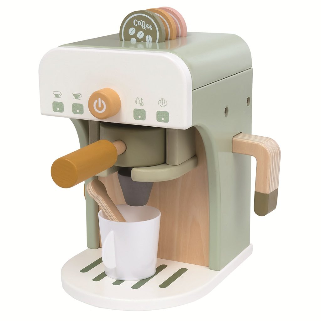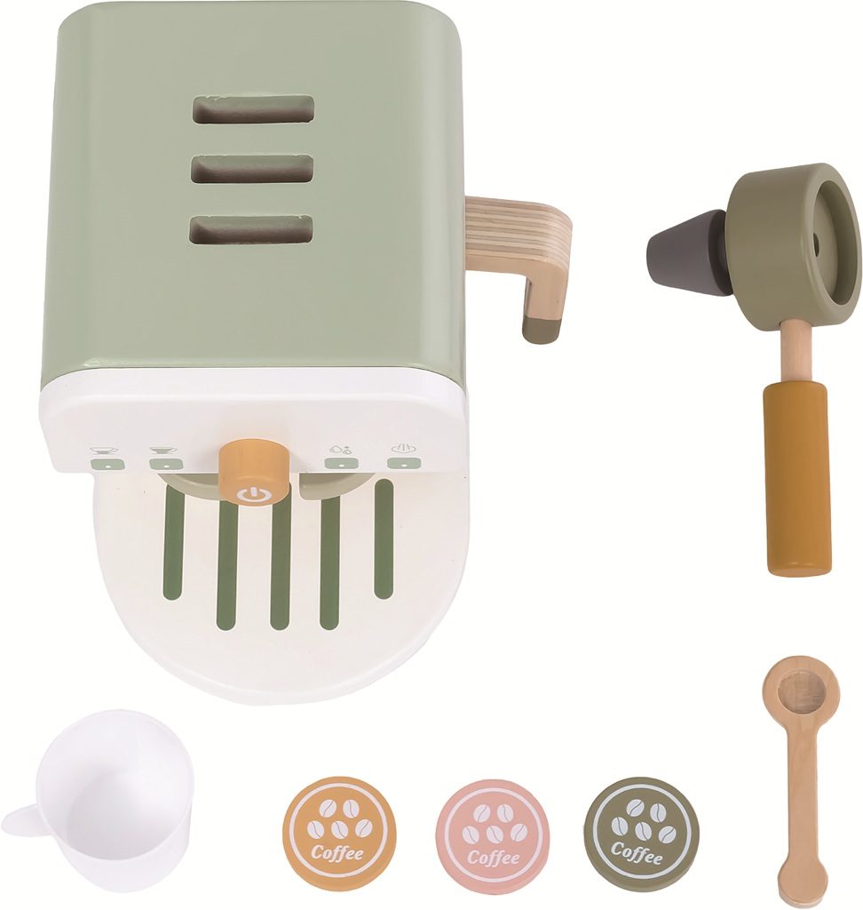 Sada kávovaru s doplňky pro všechny malé baristky a baristy a budoucí milovníky kávy. Je libo espresso nebo cappuccino? Dřevěný pákový kávovar s realistickými detaily má tři vyměnitelné kapsle, hrneček, lžičku a samozřejmě páku na kávu, která se dá zasunout přímo do přístroje. Kapsle si děti mohou uložit do výřezů na horní straně kávovaru.Hračka podporuje představivou hru, rozvíjí jemnou motoriku, koordinaci pohybů i sociální dovednosti. Děti si mohou hrát samy nebo obsluhovat hosty ve své vlastní kavárně. Příjemné pastelové a zemité odstíny barev spolu s kvalitním přírodním dřevem dělají z této hračky krásný doplněk každého pokojíčku. Obsah balení: kávovarpáka na kávu 3 kapslehrnečeklžička Hlavní vlastnosti: pákový kávovar s příslušenstvímrealistický design a funkční detailypodporuje představivou hrurozvíjí jemnou motoriku a koordinacipřírodní dřevo v kombinaci se zemitými tóny ideální doplněk do dětské kuchyňkyvhodné pro děti od 2 let