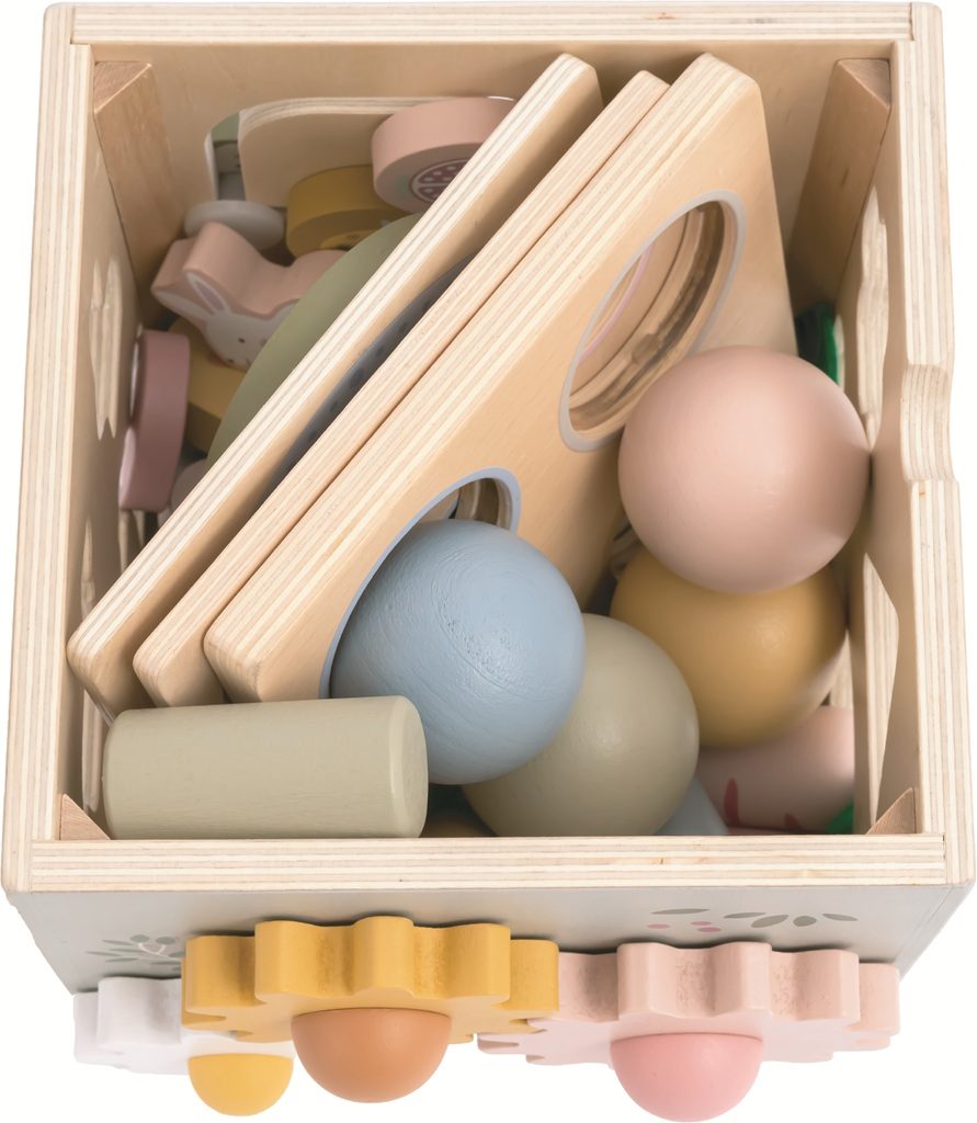 Objevujte svět a učte se zábavnou formou! Dřevěná motorická kostka s motivy farmy nabízí dětem pestrou škálu herních aktivit, které rozvíjejí jemnou motoriku, logické myšlení i koordinaci ruka-oko. Každá strana kostky přináší jinou zábavnou výzvu – od vkládání zvířátek, přes otáčení ozubenými kolečky, až po barevné vkládačky nebo jednoduché počítání. Hračka navíc obsahuje vyměnitelná víka s různými herními možnostmi. Děti mohou například přiřazovat obrázková kolečka ke správným předlohám a tím trénovat zrakové vnímání, třídění a soustředění. Nechybí ani oblíbená zatloukací hra, při které lze zatloukat dřevěné mrkvičky nebo kuličky. Během hry se děti učí rozpoznávat základní tvary, barvy i zvířátka. Veškeré díly lze uložit uvnitř kostky, takže po hraní zůstává vše pohromadě a nic se neztratí. Díky jemným pastelovým barvám a roztomilým ilustracím zvířátek je hračka nejen atraktivní a zábavná, ale je i pěkným doplňkem dětského pokojíčku či herny. Hlavní vlastnosti: 37 dílů5 herních stran plných aktivitvyměnitelná víka s různými hramivkládací puzzle se zvířátky a tvarydřevěná kladívková hra s mrkvičkamiozubená kolečka pro trénink jemné motorikyvše lze uložit dovnitř kostkyvhodné pro děti od 12 měsíců