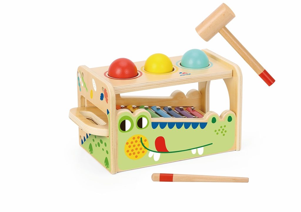 Podpořte zájem o hudbu u svých dětí! Xylofon a zatloukací hračka 2 v 1 jsou dvě samostatné, ale propojené hračky, které nabízejí dětem možnost objevovat rytmus a zvuky a současně rozvíjet motorické dovednosti. Roztomilý krokodýl vyrobený z odolného dřeva s integrovaným xylofonem je dvakrát zábavnější. Tři dřevěné koule po úderu kladívka propadnou otvory v horní části a vytvářejí zvuky na xylofonu, když na něj dopadnou. Xylofon s barevně odlišenými klávesami lze vyjmout a hrát na něm samostatně pomocí dřevěné paličky. Hračka je vyrobena ze dřeva s certifikací FSC® v barevné kombinaci jemných odstínů s barvou přírodního dřeva. Nejedná se o hudební nástroj, ale pouze o hračku. Hlavní vlastnosti: úvod do světa zvuků a rytmurozvíjí obratnost a uchopovací dovednostivyrobeno ze dřeva s certifikací FSC®vhodné od 1 roku věku Značka a certifikát FSC® (Forest Stewardship Council) zaručuje, že dřevo, ze kterého byl produkt vyroben, nebylo vytěženo nelegálně a pochází z lesů obhospodařovaných šetrným či přírodě blízkým způsobem, ve kterém jsou dodržovány přísné environmentální a sociální požadavky. Značka FSC® na výrobku znamená, že svým nákupem pomáháte chránit lesy a podporujete šetrné, odpovědné či přírodě blízké hospodaření, díky kterému jsou naše lesy stabilnější, zdravější, mají přirozenou druhovou skladbu a lépe odolávají negativním následkům klimatických změn.