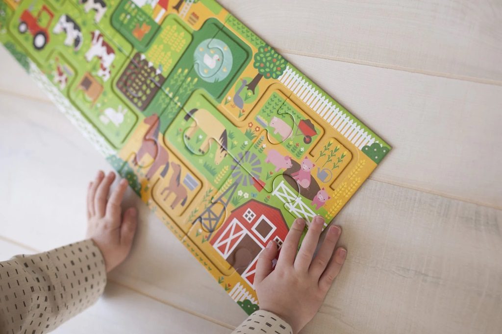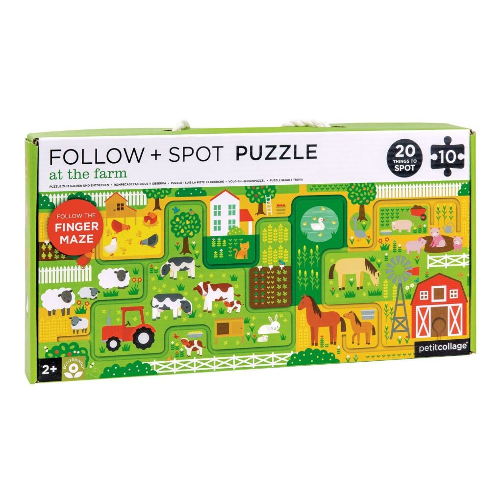 Následujte cestičky, dorazíte díky nim do několika různých destinací! Najdete na farmě všech 20 z těchto destinací? Zábava začíná po složení tohoto 10 dílného puzzle. Děti následují bludiště prstem, během této cesty musí najít 20 různých předmětů. Hlavní vlastnosti: 10 velkých dílků puzzleJeďte po bludišti prstem a najděte 20 předmětůNatištěno na recyklovaném papíře barvami na bázi zeleninySplňuje a překonává všechny bezpečnostní standardy