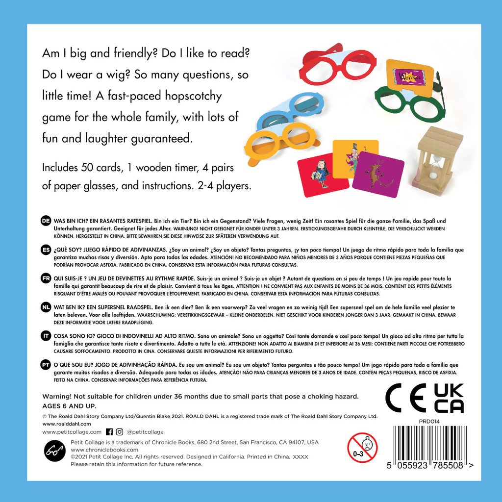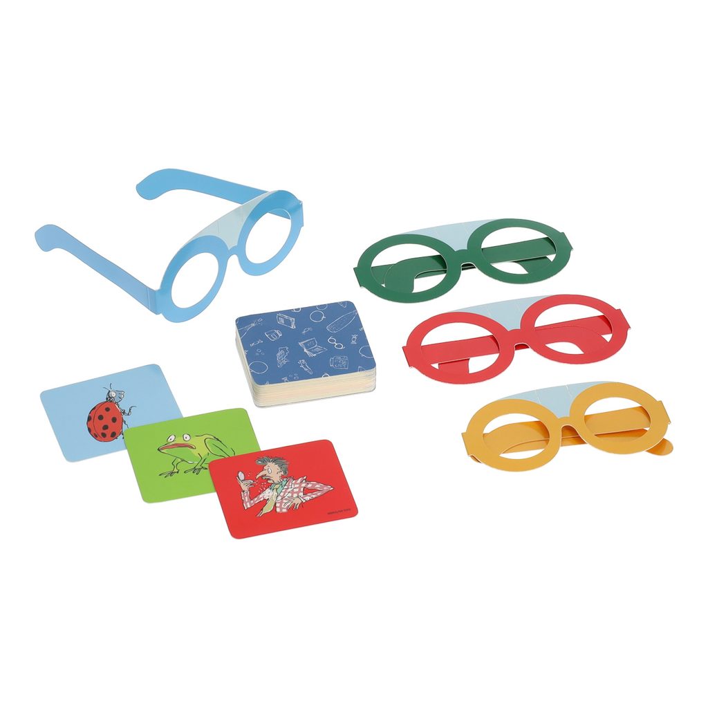 Vylosujte si kartičku, vložte ji do legračních brýlí, aby ji viděli jen ostatní, a otočte přesýpací hodiny. Sérií svých otázek a odpovědí spoluhráčů se pak ve vyměřeném čase pokuste rozklíčovat, jakou postavu, nebo předmět ze světoznámých příběhů Roalda Dahla jste si vylosovali. Času máte málo, otázky musíte rychle, ale pečlivě vážit! Karty zdobí původní, originální ilustrace z knih. Obsažené brýle jsou ve dvou velikostech, pro děti i dospělé, hra je tak zvláště vhodná pro chvíle trávené v rodinném kruhu. Součásti jsou vyrobeny z udržitelně získaného papíru, potištěny rostlinnými inkousty a baleny v praktické, barevně ilustrované krabičce. Hlavní vlastnosti:pro 2–4 hráče4 papírové brýle, 50 ilustrovaných karet a přesýpací hodinyilustrace sira Quentina Blakeavyrobeno ze 100% FSC® certifikovaného papírupotištěno rostlinnými inkousty Značka a certifikát FSC® (Forest Stewardship Council) zaručuje, že dřevo, ze kterého byl produkt vyroben, nebylo vytěženo nelegálně a pochází z lesů obhospodařovaných šetrným či přírodě blízkým způsobem, ve kterém jsou dodržovány přísné environmentální a sociální požadavky. Značka FSC® na výrobku znamená, že svým nákupem pomáháte chránit lesy a podporujete šetrné, odpovědné či přírodě blízké hospodaření, díky kterému jsou naše lesy stabilnější, zdravější, mají přirozenou druhovou skladbu a lépe odolávají negativním následkům klimatických změn.