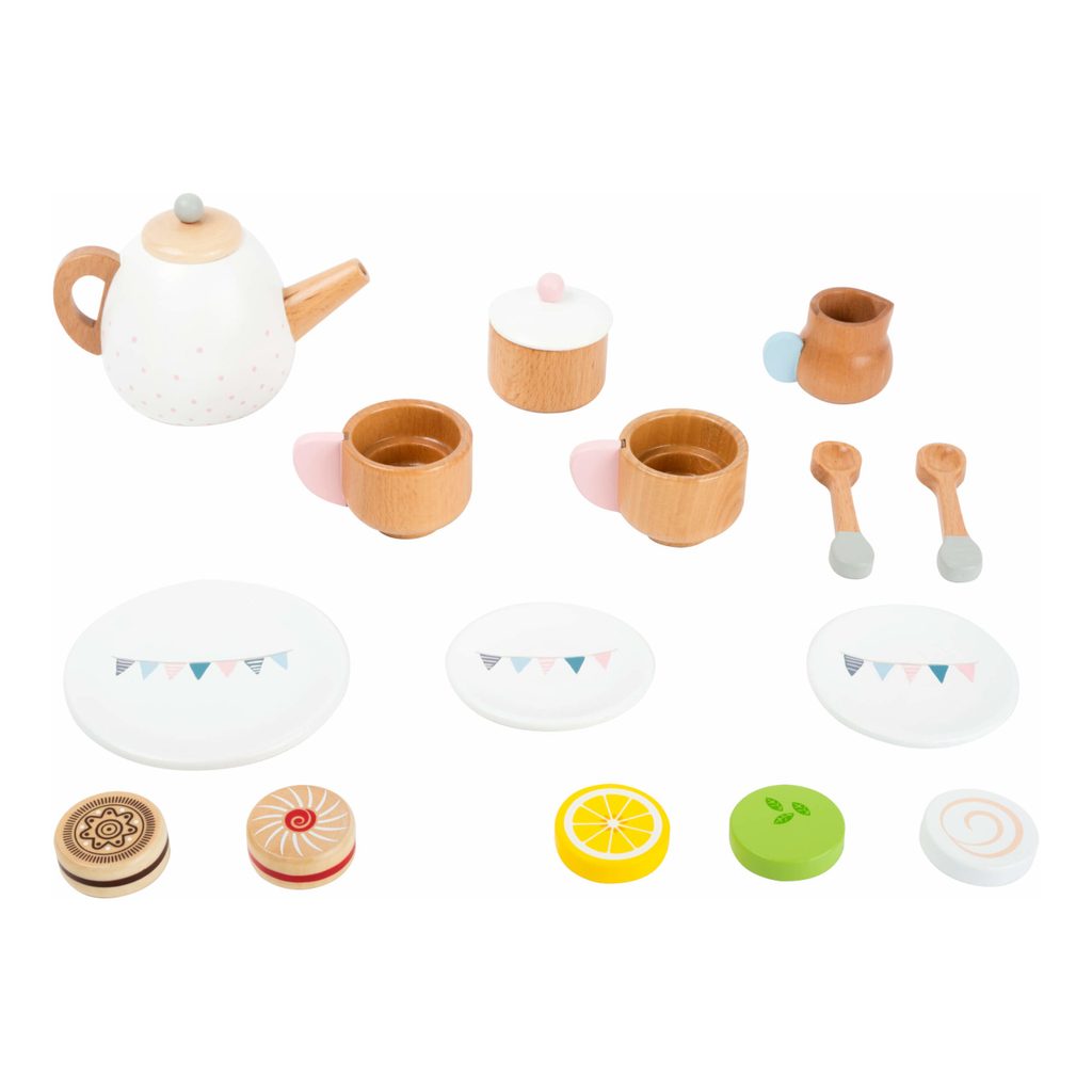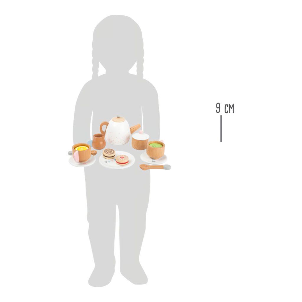 Máte chuť na lahodný čaj, nebo kávu se zákuskem? Zprostředkujte svým dětem možnost sehrát roli způsobných hostitelů, nechejte se obsloužit a vychutnejte si s nimi sladkou přestávku! S bohatou čajovou soupravou mohou děti rozvíjet fantazii, učit se pravidlům servisu a společenskému chování. Překvapí Vás pečlivým zpracováním z masivního dřeva, součásti jsou robustní a zvláště přizpůsobené dětským ručkám. Přírodní materiál dovedně přiznává a hravě kombinuje s jemnými pastelovými odstíny. Provedení klade důraz na detail, víčka konvičky i cukřenky jsou proto odnímatelná a hra může být ještě uvěřitelnější. Sadou můžete vhodně doplnit dětskou kuchyňku, stánek, nebo makety dezertů. Hlavní vlastnosti:konvička s víčkem, 2 šálky s podšálky a lžičkami, 3 různé kapsle náplní, mlékovka, cukřenka s víčkem, talířek a 2 makety sušenekatraktivní a robustní provedení z masivního dřeva