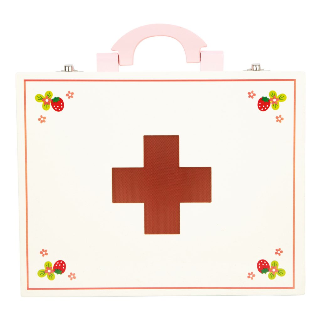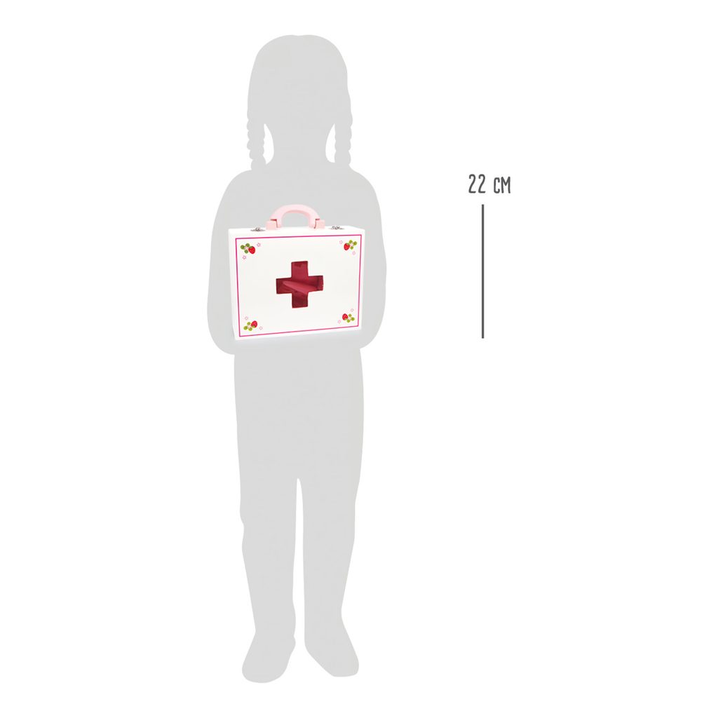 Dřevěný barevný kufřík pro malou ošetřovatelku obsahuje 24 kusů různobarevného dřevěného příslušenství včetně textilní čelenky s červeným křížem. Kufřík obsahuje vše co každý doktor potřebuje - teploměr, stetoskop, injekční stříkačku, masti, léky... Vše vyrobené ze dřeva. Motiv jahody na jednotlivých nástrojích doplňuje veselý design. Hlavní vlastnosti: obsahuje 24 ks lékařských nástrojů a pomůcek podporuje kreativitu a komunikaci