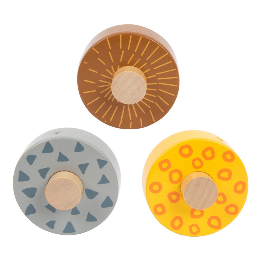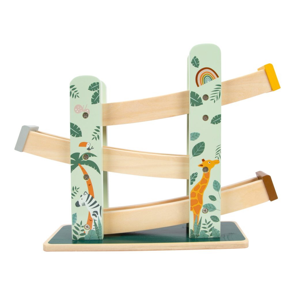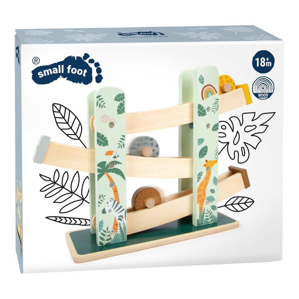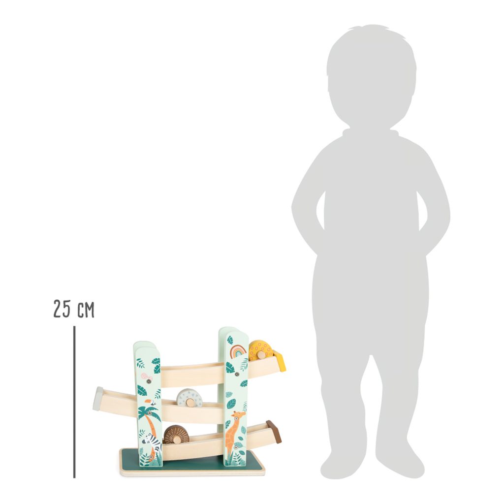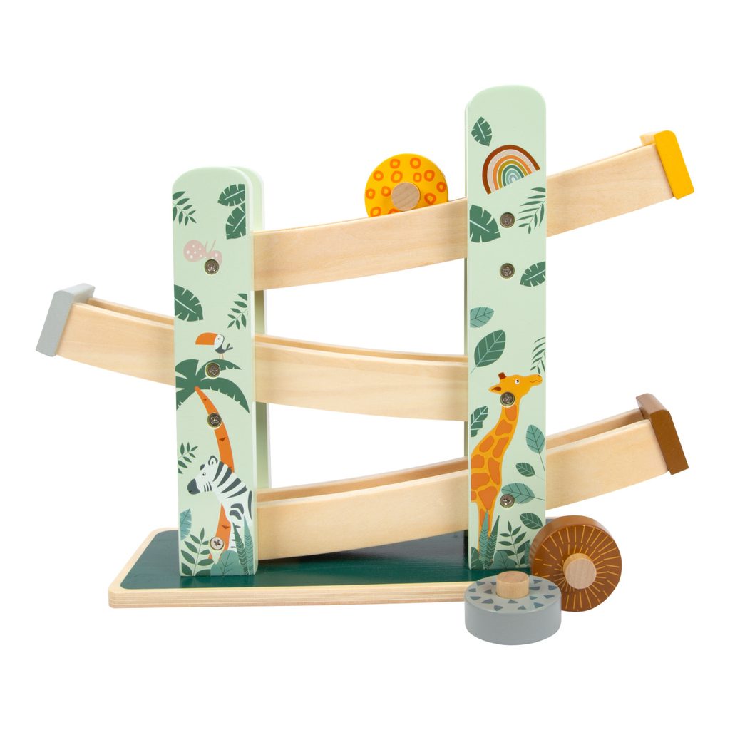 Kutálejí se přírodou, nabírají rychlost. Tři dřevěná kolečka s rozdílnou ilustrací a vzory se kutálí dolů po třech rampách. Dráha je dekorována ilustracemi safari zvířat a rostlin z džungle. Krásná hračka, která slibuje dlouhotrvající zábavu. Hlavní vlastnosti: pastelové barvydráha a 3 kotouče