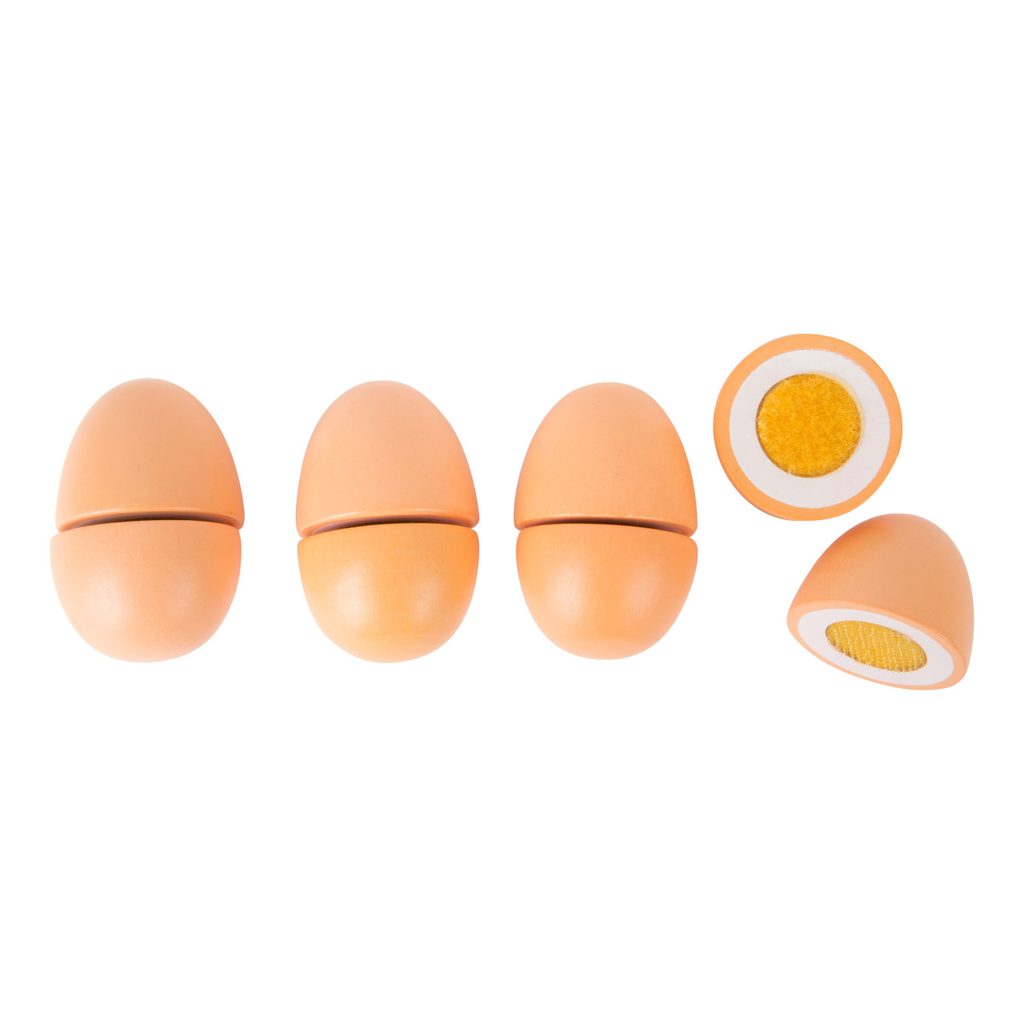 Tyto čtyři vajíčka vyrobená z robustního dřeva drží pohromadě díky suchému zipu a lze je oddělit dřevěným nožem. Karton na vejce je vyrobený z lepenky a zajišťuje tak bezpečnou přepravu. Vejce jsou vhodným doplňkem do dětské kuchyňky. Hlavní vlastnosti: spojené suchým zipemrozvíjí motoriku dětí
