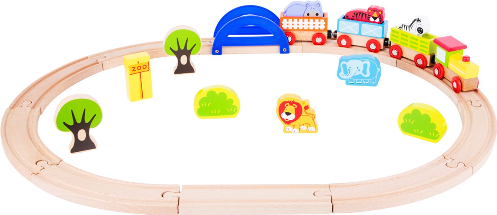 Projeďte se touto zoo! Vlaková souprava včetně rozsáhlé sady příslušenství může vykreslit zajímavý příběh. Vláček, vagónky, stromy, keře, můstek, cedule zoo či figurky zvířat budou hlavními postavami této okružní poznávací jízdy. Naložené vagónky lze k vláčku zapojit pomocí magnetu. Produkt je kompatibilní s dřevěnými vláčkodráhami jiných výrobců. Hlavní vlastnosti: obsahuje 24 dílůkompatibilní s dřevěnými vláčkodráhami dalších výrobcůpodporuje představivost, obratnost a koordinaci