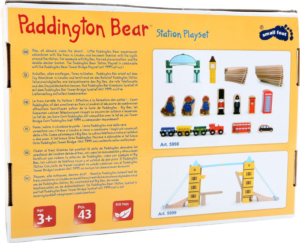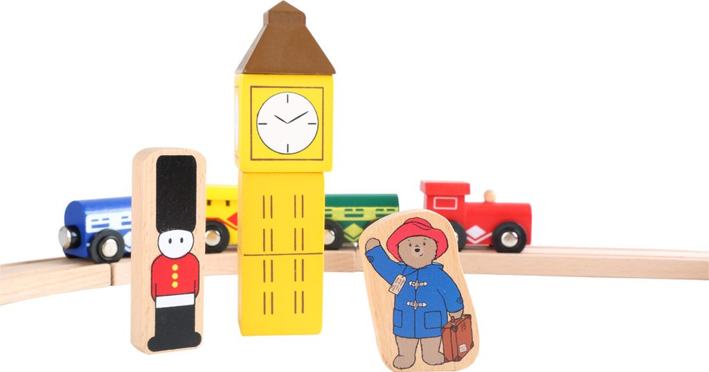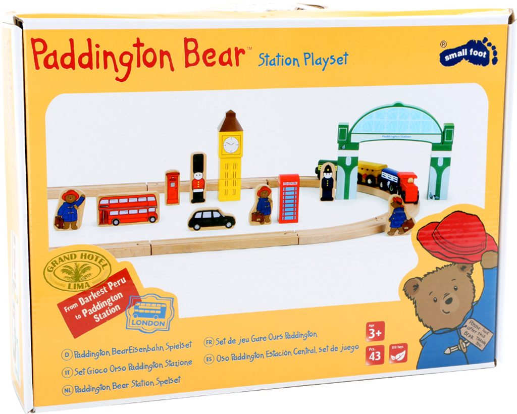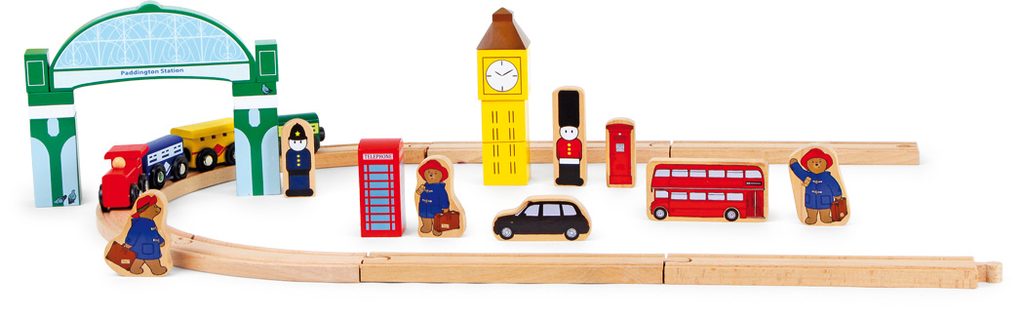 Prosím, nastupte, dveře se zavírají! Paddington se vydává na cestu. Tato skvělá stanice je vybavena dřevěnými kolejemi a má vlastní nádražní halu. Má také různě potištěné dřevěné prvky zobrazující slavné věci anglické metropole jako Big Ben, červenou telefonní budku nebo červený vyhlídkový autobus. V neposlední řadě je to vláčkodráha, která Paddingtona proveze světem. Hlavní vlastnosti: obsahuje 43 dílůvláčky se spojují magnetemdřevěné prvky symbolizující anglickou metropolipodporuje představivost, obratnost a koordinaci