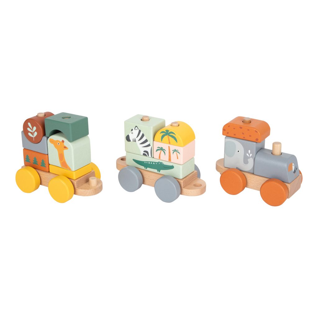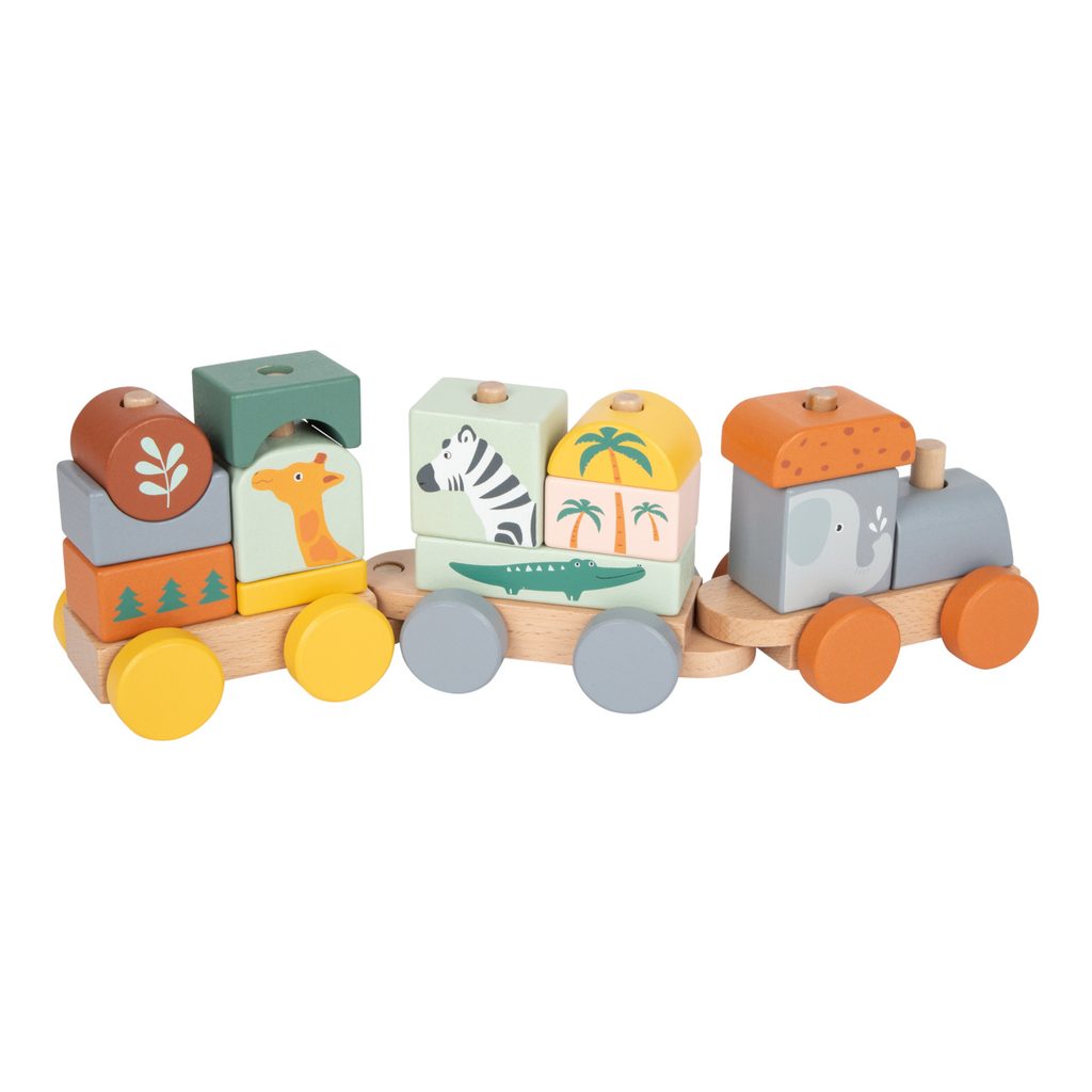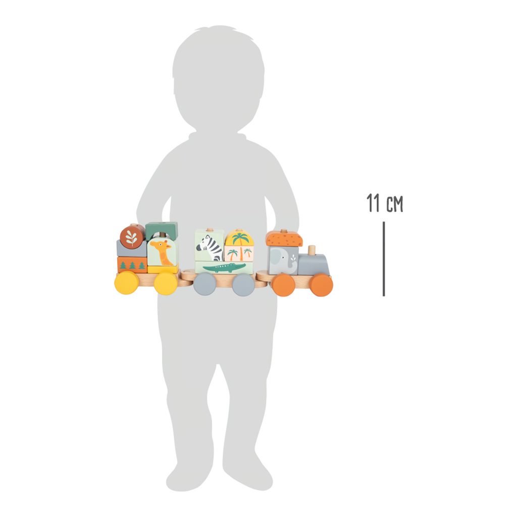 Složte jej a vyražte ze stanice! Tento dřevěný vláček v trendy barvách se rozjede až po nastoupení všech pasažérů – zebry, slona, žirafy a krokodýla. Vláček s mnoha detaily je zároveň nasazovací hračkou, která dává dětem volnost při skládání – každá kostka pasuje na více míst. Příští zastávka: Safari! Hlavní vlastnosti: ilustrováno v pastelových barváchobsahuje 1 lokomotivu, 2 vagóny a 13 dílůtrénuje motoriku a představivost
