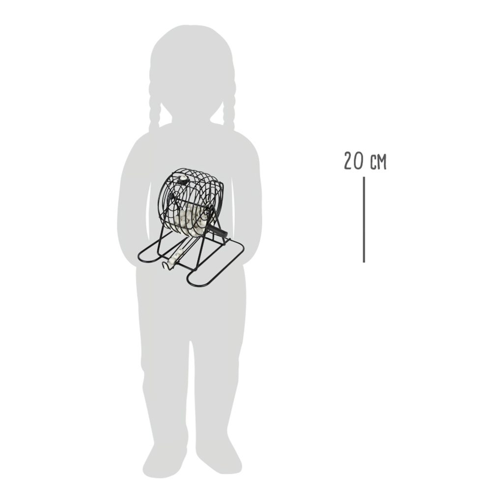 Klasická soutěžní hra "Bingo" s barevnými žetony, bílými kuličkami, plastovým zásobníkem a losovacím kovovým bubnem. Každý hráč si může vybrat svou vlastní barvu žetonů. Klika otáčí bubnem a jakmile se změní směr, první očíslovaná kulička spadne do přihrádky. Komu se podaří umístit správnou kombinaci jako první? Své štěstí si mohou zkusit jak malí, tak velcí hráči. Hlavní vlastnosti: obsahuje: barevné žetony, bílé kuličky, plastový zásobníklosovací buben je kovový děti se učí poznávat čísla