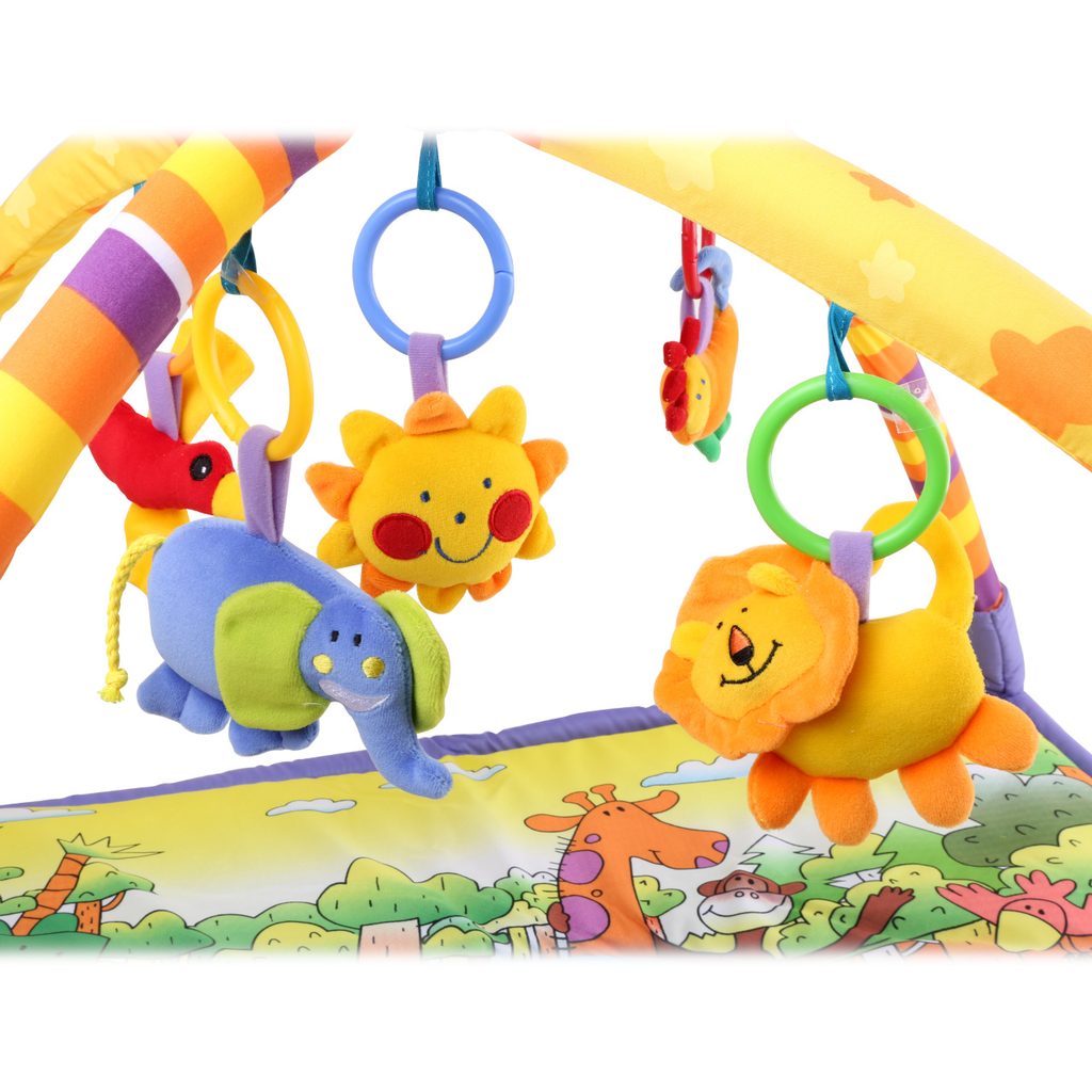 Kdo by nechtěl dovádět obklopený těmi nejroztomilejšími zvířátky! Příjemně měkká pestrobarevná podložka zdobená zvířecími motivy umožňuje nejmenším pohodlně ležet a hrát si s plyšovými hračkami pod klenbou z měkkých a pružných podpěr. Poutavé hračky různě chrastí, nebo pískají, přispívají tak k vývoji dětských smyslů a motoriky, motivují a postupně učí děti sedět. Jsou zavěšené na rozevíratelných kroužcích umožňujících jejich odepnutí, děti tak mohou mít své oblíbence vždy u sebe. Podložka je skladná a snadno rozložitelná, balená a dodáváná v praktické, snadno přesnosné plastové tašce. Hlavní vlastnosti: příjemně měkké, bezpečné a pohodlné provedení5 odnímatelných plyšových hračekzvukové efekty chrastění a pískánípraktické balení