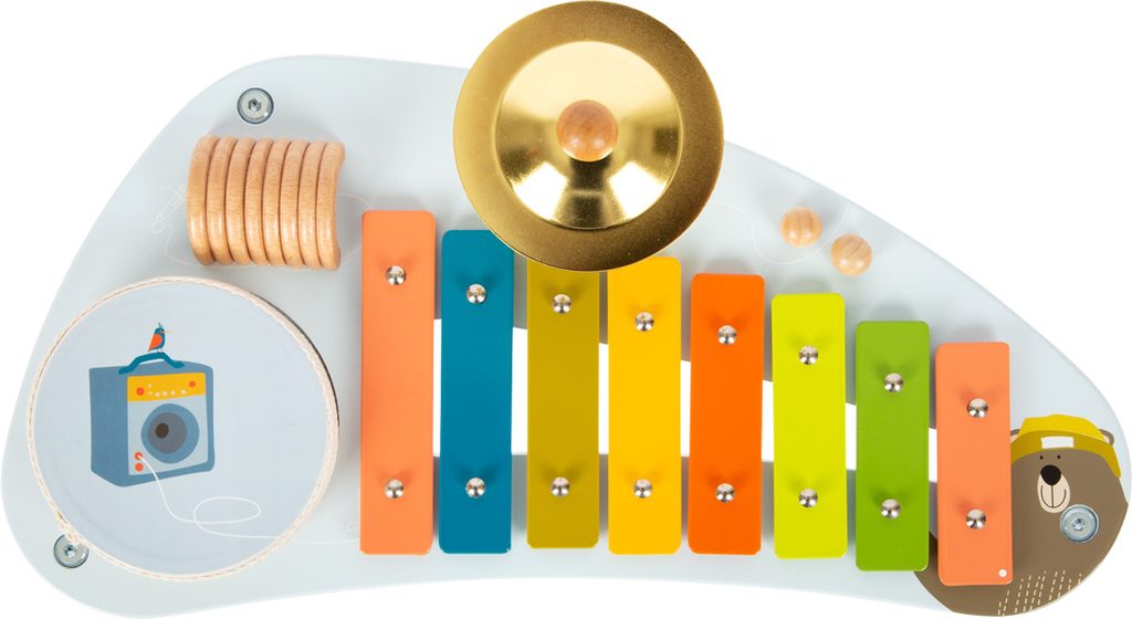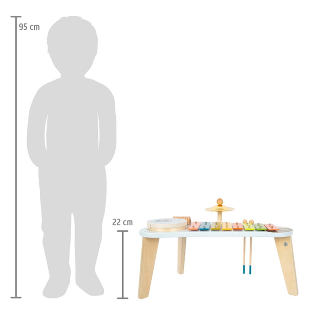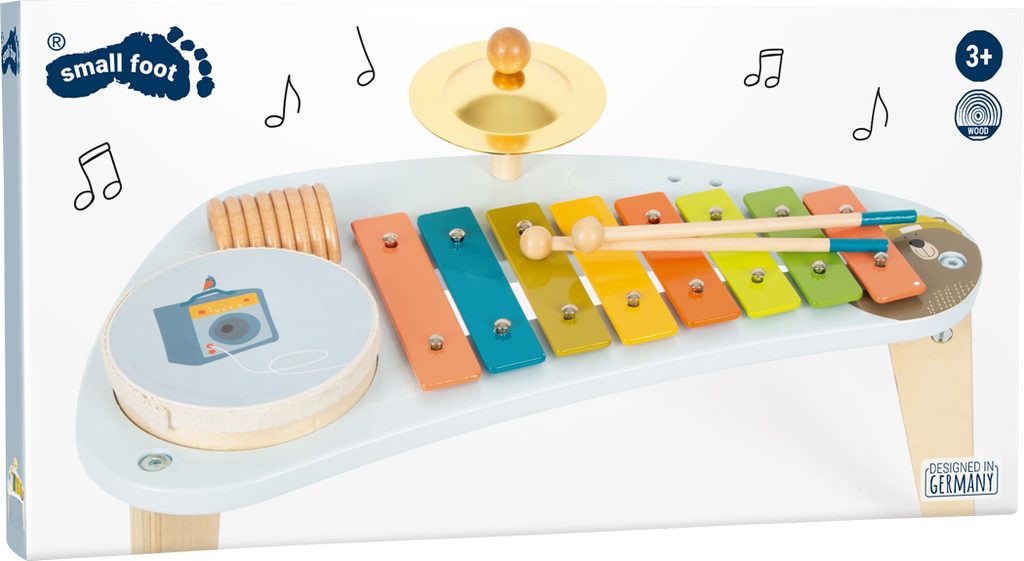 Medvěd Bruno vytváří hudbu! Tento robustně zkonstruovaný hudební stoleček stojí na třech nohách a povzbuzuje děti, aby hrály na různé nástroje a objevovaly nové zvuky s činely, xylofonem, chrastítkem a odnímatelným bubnem. Klapky xylofonu jsou barevně odlišeny, takže první písničky jsou pro děti snadné! Dodává se s robustními paličkami z masivního dřeva a notami. Je to spousta motivující hudby a zábavné učení! Vizuálně tento hudební a zvukový stoleček vyniká svým veselým designem a harmonickou kombinací přírodního dřeva a moderních modrých barev! Kromě nácviku akustického vnímání tento nástroj hravě trénuje i smysl pro rytmus, rytmiku a první porozumění hudebním tónům. Hlavní vlastnosti: Rozvíjí jemnou motoriku a kreativituHravý úvod do světa zvuku a rytmuKlapky xylofonu vydávají odlišné tónyStoleček vše v jednom