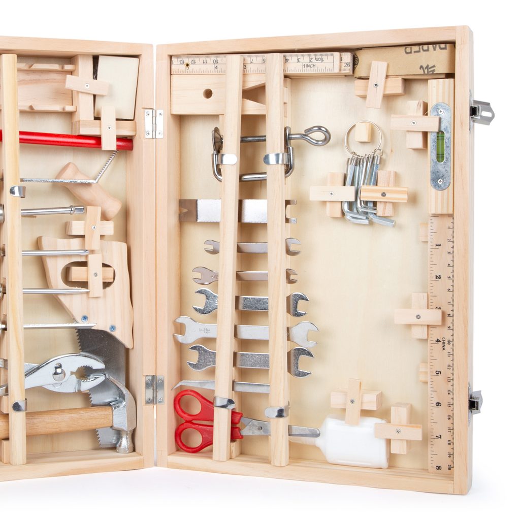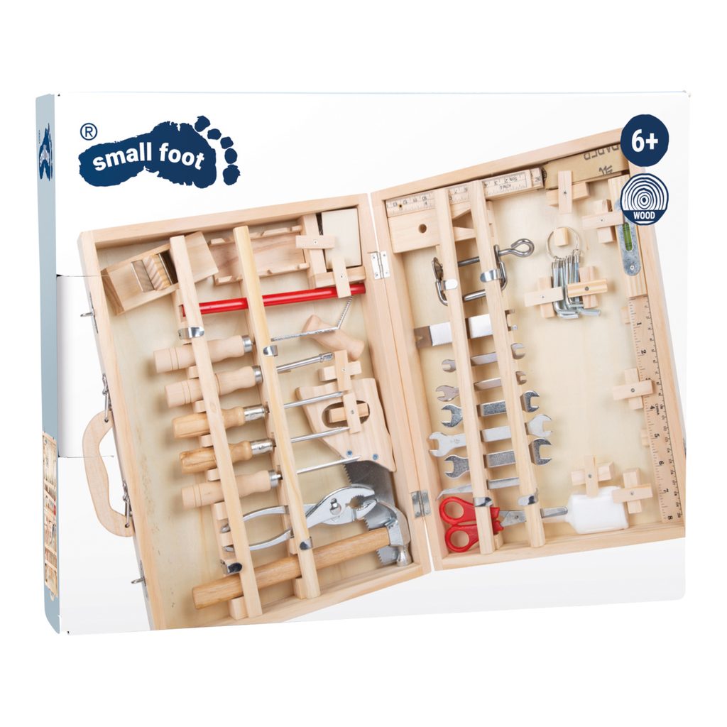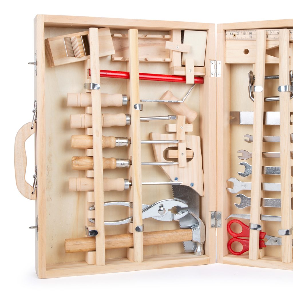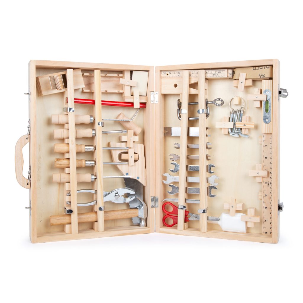 Kufřík Deluxe je komplexní sada nářadí: Závěsná dřevěná krabice s 48 díly pro malé domácí kutily! V kufříku Deluxe najdete všechno potřebné dřevěné i kovové nářadí pro všechny druhy prací a oprav. Najdete v něm klíče, šroubováky, pilu, nůžky, dláto, tesařskou tužku, šestihranný klíč, kladivo a další! Každá položka má své místo v kufru, všechny díly jsou vybaveny pojistkami, které je na svém místě drží. Hlavní vlastnosti: komplexní sada obsahuje 48 dílů praktický dřevěný kufr na uložení