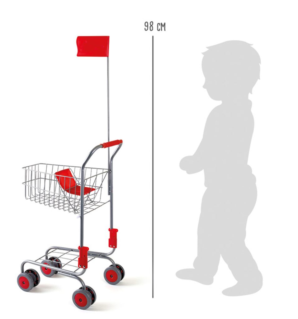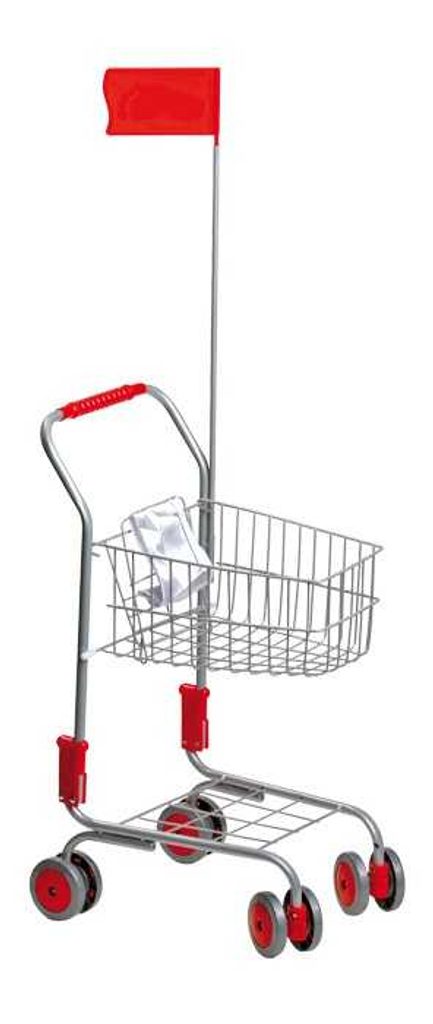 S tímto nákupním vozíkem bude pro děti nakupování velmi zábavné. Díky stříbrnému designu tohoto klasického nákupního vozíku uděláte skvělý dojem na mladé nakupující. Dodává se s červenými akcenty na kolečkách, rukojeti, rámu, s červenou vlajkou a také skládací sedačkou pro panenky. Přední kola se mohou otáčet o 360 stupňů, takže se tento nákupní vozík snadno ovládá. S tímto nákupním vozíkem mohou i ty nejmenší děti napodobovat své rodiče a jít nakupovat stejně jako dospělí. Košík nabízí dostatek prostoru pro uložení potravin a hraček, je tedy perfektní doplněk do hracích obchodů. Hlavní vlastnosti: o 360 stupňů otáčející se přední kolavýška úchopu 60 cm snadné ovládání