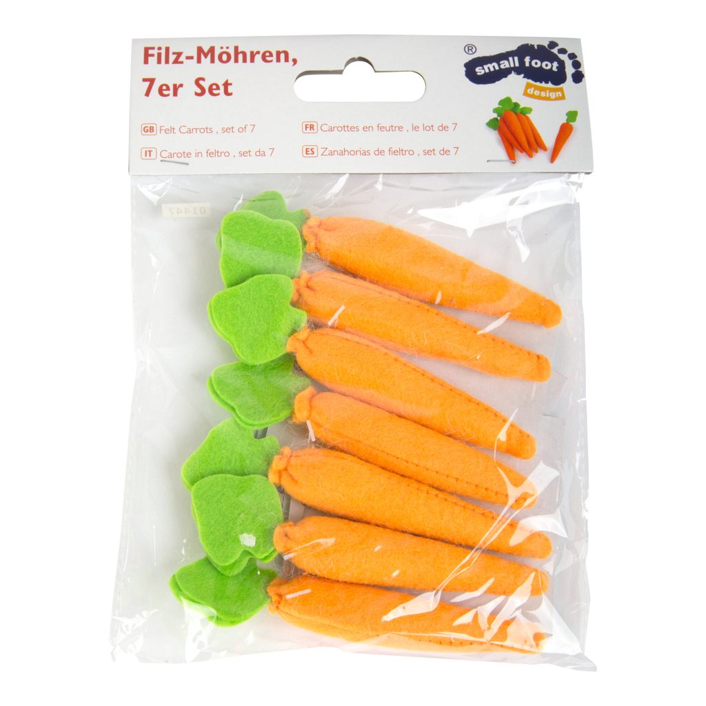 Balení obsahuje 7 ks plstěných mrkviček. Tyto mrkve upoutají pozornost a doplní každý zelinářský obchod. Mrkvičky se také skvěle hodí jako krmivo koně, poníka nebo králíčka. Hlavní vlastnosti: doplněk do dětské kuchyně, obchodu s potravinami nebo jako krmivo na farmu