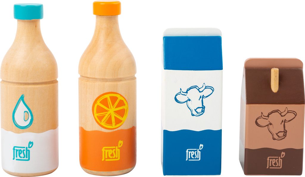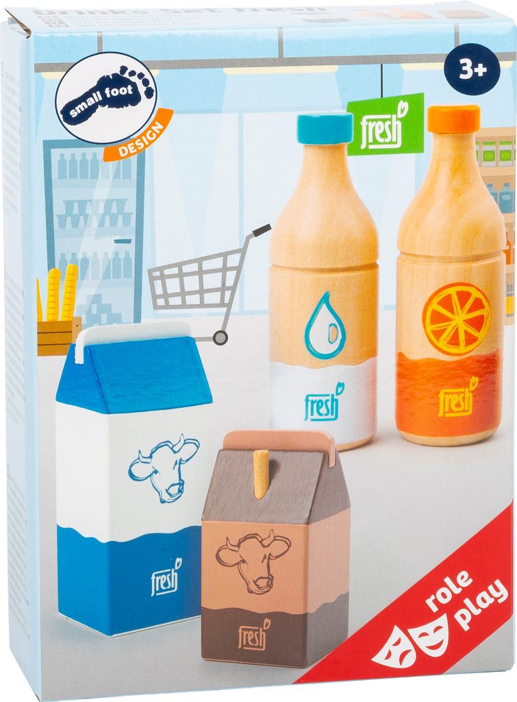 Čtyři nápoje okamžitě zaženou žízeň! Tato čtyřdílná dřevěná nápojová sada obsahuje láhev pomerančového džusu, láhev vody, krabici čerstvého mléka a malé kakao s brčkem. Výstižné ilustrace a ikonické barevné provedení je snadno čitelné. Dřevěné provedení zaručuje dlouhotrvající kvalitu. Hlavní vlastnosti: obsahuje 4 ks nápojůpodporuje hraní rolí v kuchyňkách a obchodech