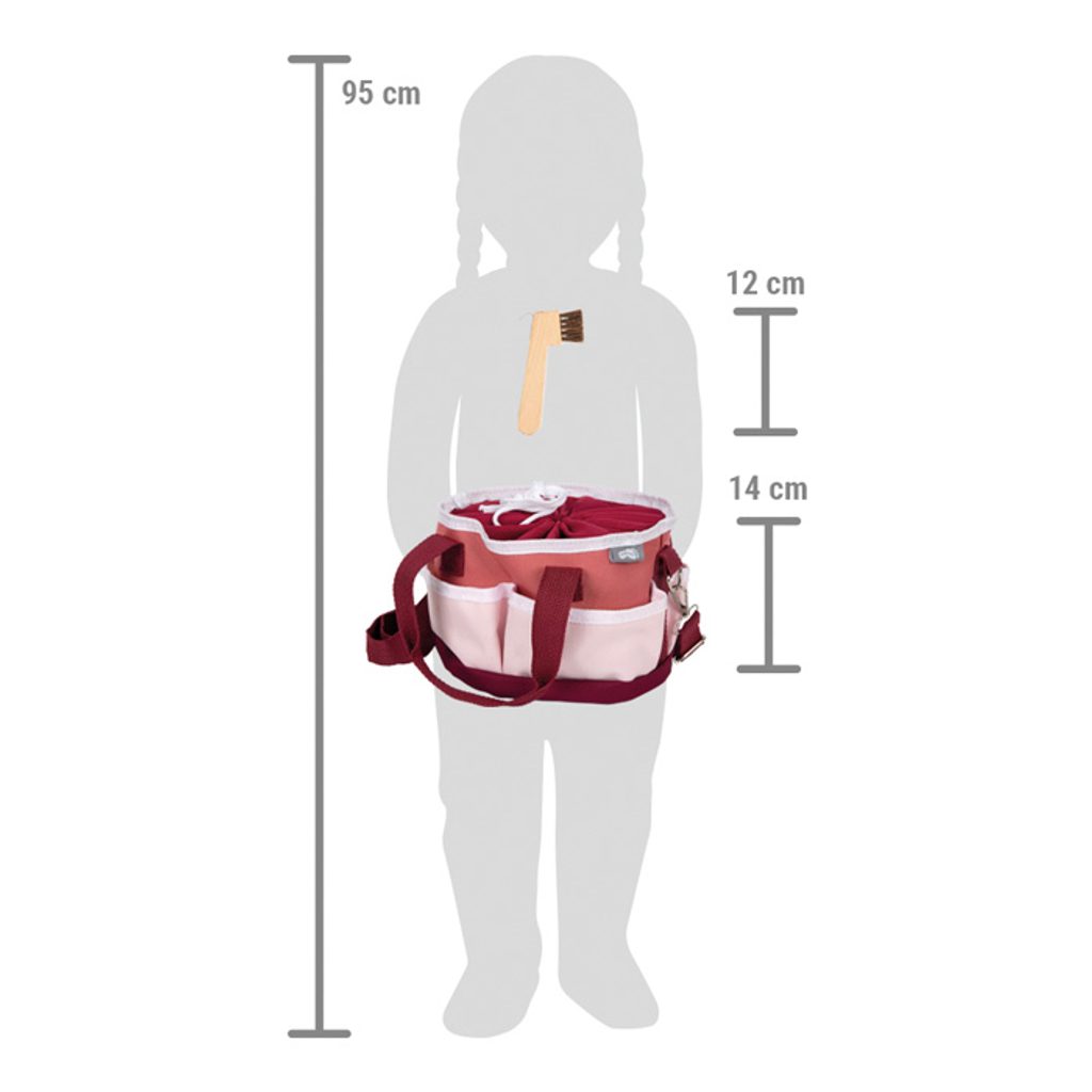 Taška s příslušenstvím na čištění a péči o koně. Je vhodná pro všechny děti, které mají rády koníky. Taška je odolná, praktická a dostatečně prostorná, aby pojala veškeré vybavení. Péče o koně je součástí každodenní rutiny každého fanouška koní a koníci kartáčování milují. Taška s doplňky je vyrobená z vysoce kvalitních materiálů a máte vše, co potřebujete, hned po ruce, i když jste na cestách. Mezi doplňky patří kartáč, hřeben, škrabka na kopyta a hřeben na hřívu, to vše se vejde do prostorného vnitřku tašky a do malé boční kapsy. A samozřejmě nechybí dřevěné jablko a mrkev. Sada se dodává s turnajovou stuhou, kterou si děti mohou připevnit na obojek hlavy svého koníka nebo na vlastní oblečení. Pomůcky na čištění koní jsou dokonale přizpůsobeny potřebám mladých fanoušků koní, takže mladí jezdci mohou při hře popustit uzdu své fantazii. Pohodlná stahovací šňůrka umožňuje tašku doširoka otevřít, ale také úplně zavřít. Tuto tašku pro děti lze nosit za obě uši nebo nastavitelný ramenní popruh. S touto sadou péče se mohou děti starat o svého oblíbeného koně stejně jako profesionálové.  Hlavní vlastnosti: nezbytné příslušenství v tašce pro každého fanouška konínastavitelný ramenní popruhkomplexní sada