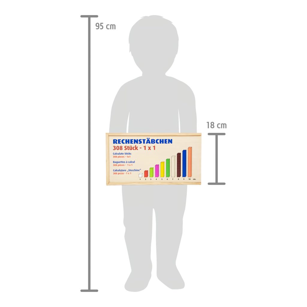 Je deset větší než tři? Tyto všestranné matematické tyčinky přispěji dětem k prvotnímu porozumění číslům a rychle a názorně je podpoří při prvních pokusech o matematické rovnice. Barevné tyčinky v různých délkách slouží jako orientační pomůcka. Děti předškolního věku získají základní matematické dovednosti při počítání, porovnávání a třídění tyčinek. Sada obsahuje 6 hnědých tyčinek, 6 modrých, 6 oranžových, 10 tmavě zelených, 10 tyčinek v barvě přírodního dřeva, 10 žlutých, 36 červených, 12 růžových, 36 světle zelených a 176 bílých tyčinek. Tyto tyčinky jsou ideální společníci pro matematické profesionály všech věkových kategorií. Trénují představivost a logické myšlení a zároveň předávají pochopení velikostí a barev. Všechny tyčinky lze po ukončení učení roztřídit a uložit do přiložené dřevěné krabice s posuvným víkem. Hlavní vlastnosti: 308 ks víceúčelových matematických tyčinek jako ideální úvod do světa číselpočítání, porovnávání a třídění přináší dítěti první základní matematické dovednostibaleno v dřevěné krabici s posuvným víkem