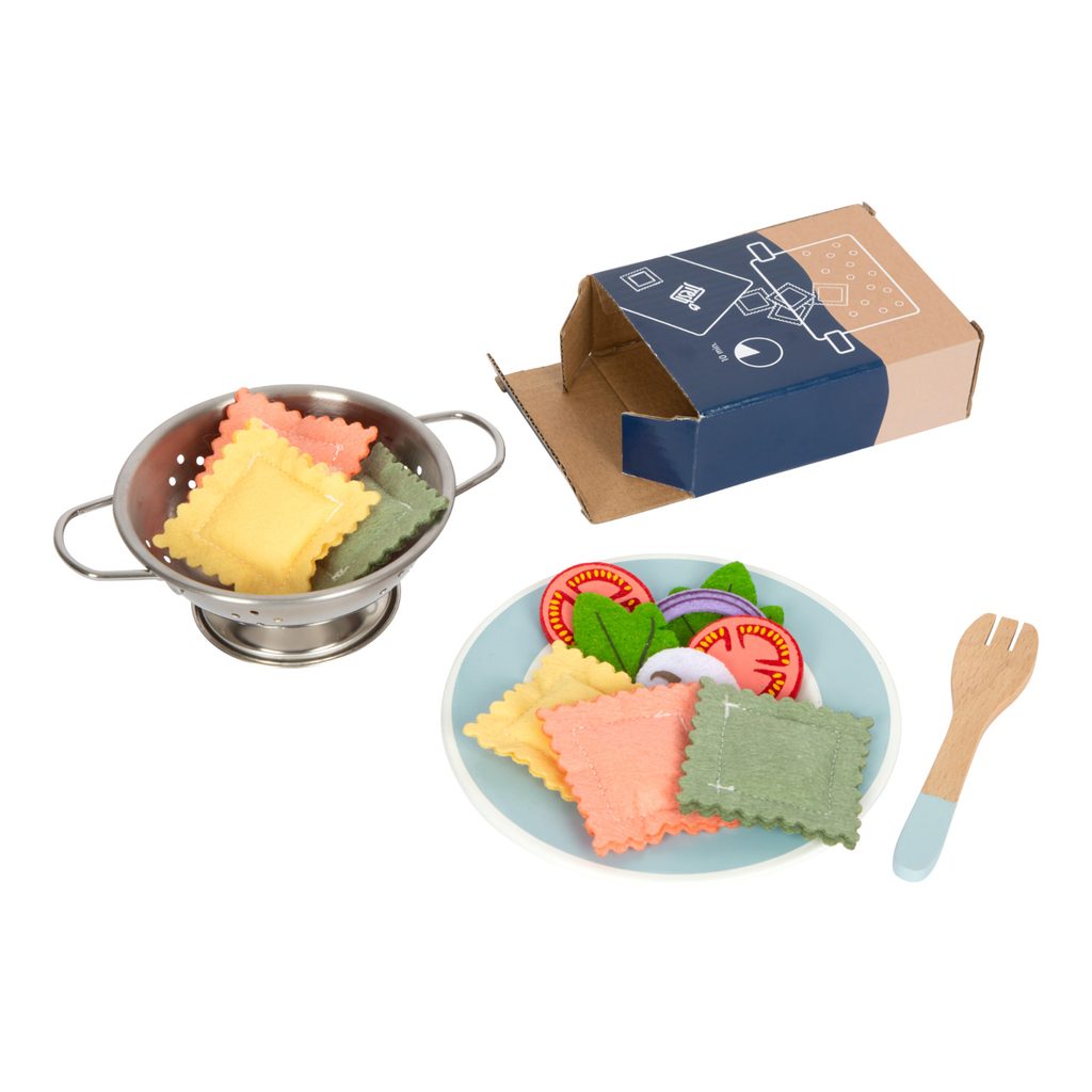 Vždy al dente! Staňte se mistry ve vaření těstovin s bohatou soupravou nádobí a rozmanitého příslušenství. V sadě naleznete atraktivní plstěné makety několika druhů těstovin a dalších přísad. Na krabičkách k ingrediencím je vyobrazen správný postup vaření, děti tak snadno znalostmi přípravy oslní návštěvu. Nádobí je realisticky vyrobené z kovu a skvěle doplní každou dětskou kuchyňku. Nezbytnou součástí je i servis, s jehož pomocí mohou děti rozvíjet sociální dovednosti. Hlavní vlastnosti:hrnec s víkem, cedník, 2 talíře, 2 vidličky, 3 balení těstovin a 12 maket přísadrealistické a odolné provedení