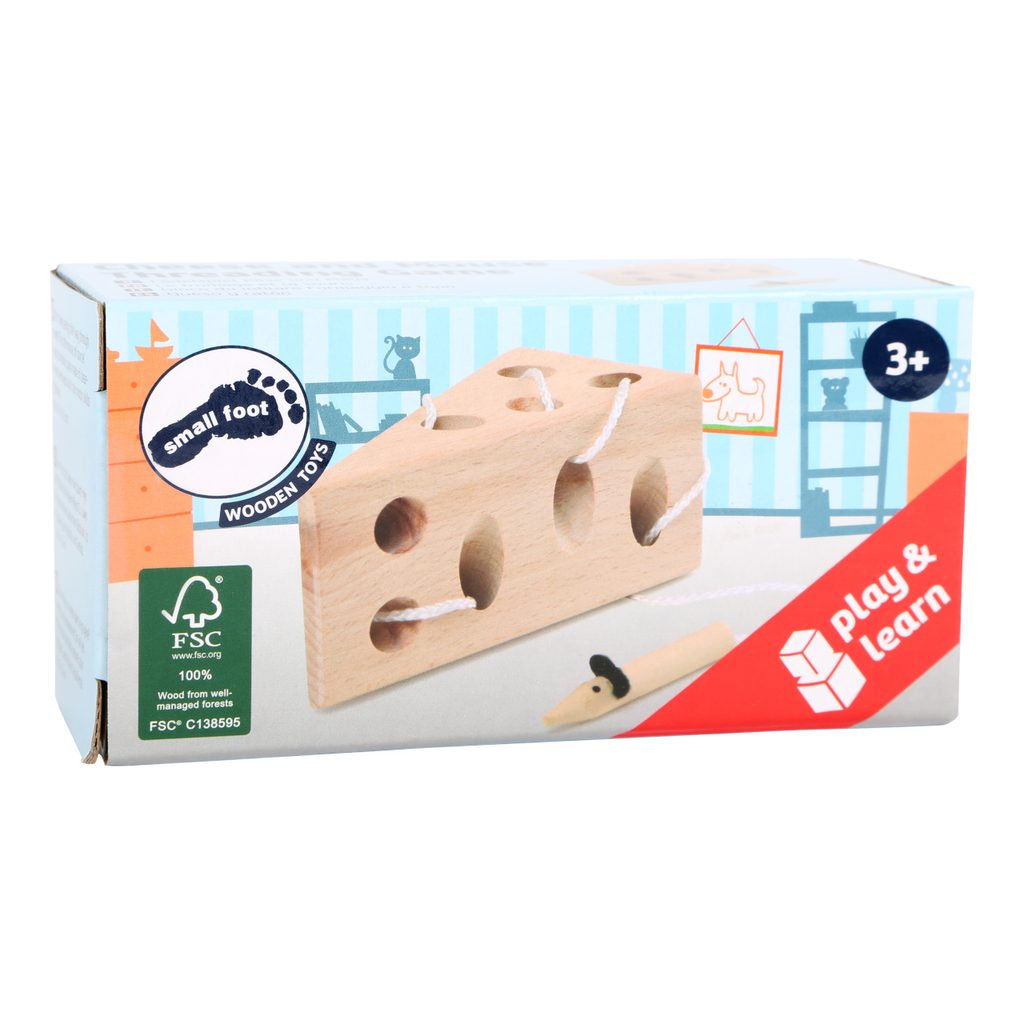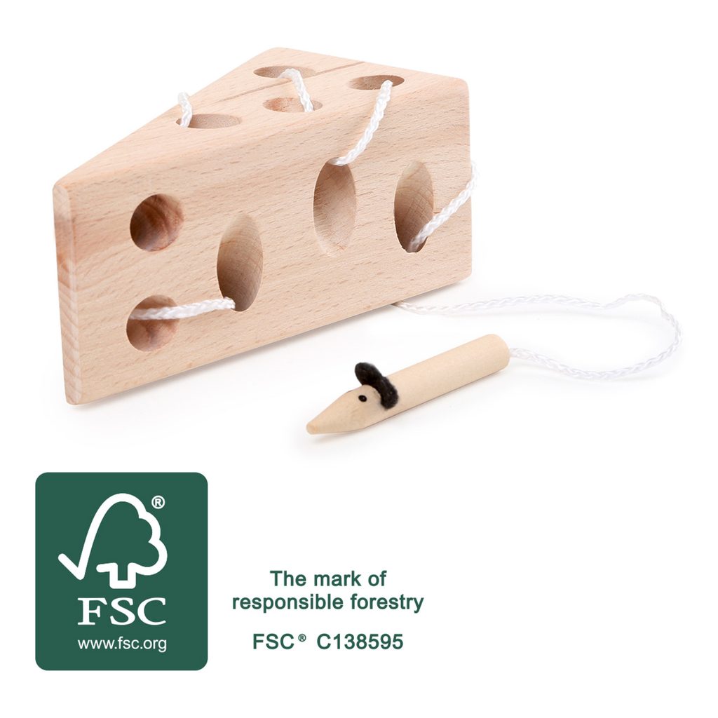 Kdo se to prokousal sýrem? Přeci malá myška! Tato krásná provlékací hra je vyrobena z přírodního lakovaného a 100% FSC certifikovaného bukového dřeva. Trénuje motoriku a trpělivost. S trochou zručnosti provlečete myšku hravě celým sýrem, procvičíte si prsty a jemnou motoriku. Hlavní vlastnosti: trénuje motoriku, zručnost100% FSC dřevo Značka a certifikát FSC® (Forest Stewardship Council) zaručuje, že dřevo, ze kterého byl produkt vyroben, nebylo vytěženo nelegálně a pochází z lesů obhospodařovaných šetrným či přírodě blízkým způsobem, ve kterém jsou dodržovány přísné environmentální a sociální požadavky. Značka FSC® na výrobku znamená, že svým nákupem pomáháte chránit lesy a podporujete šetrné, odpovědné či přírodě blízké hospodaření, díky kterému jsou naše lesy stabilnější, zdravější, mají přirozenou druhovou skladbu a lépe odolávají negativním následkům klimatických změn.