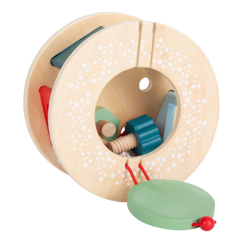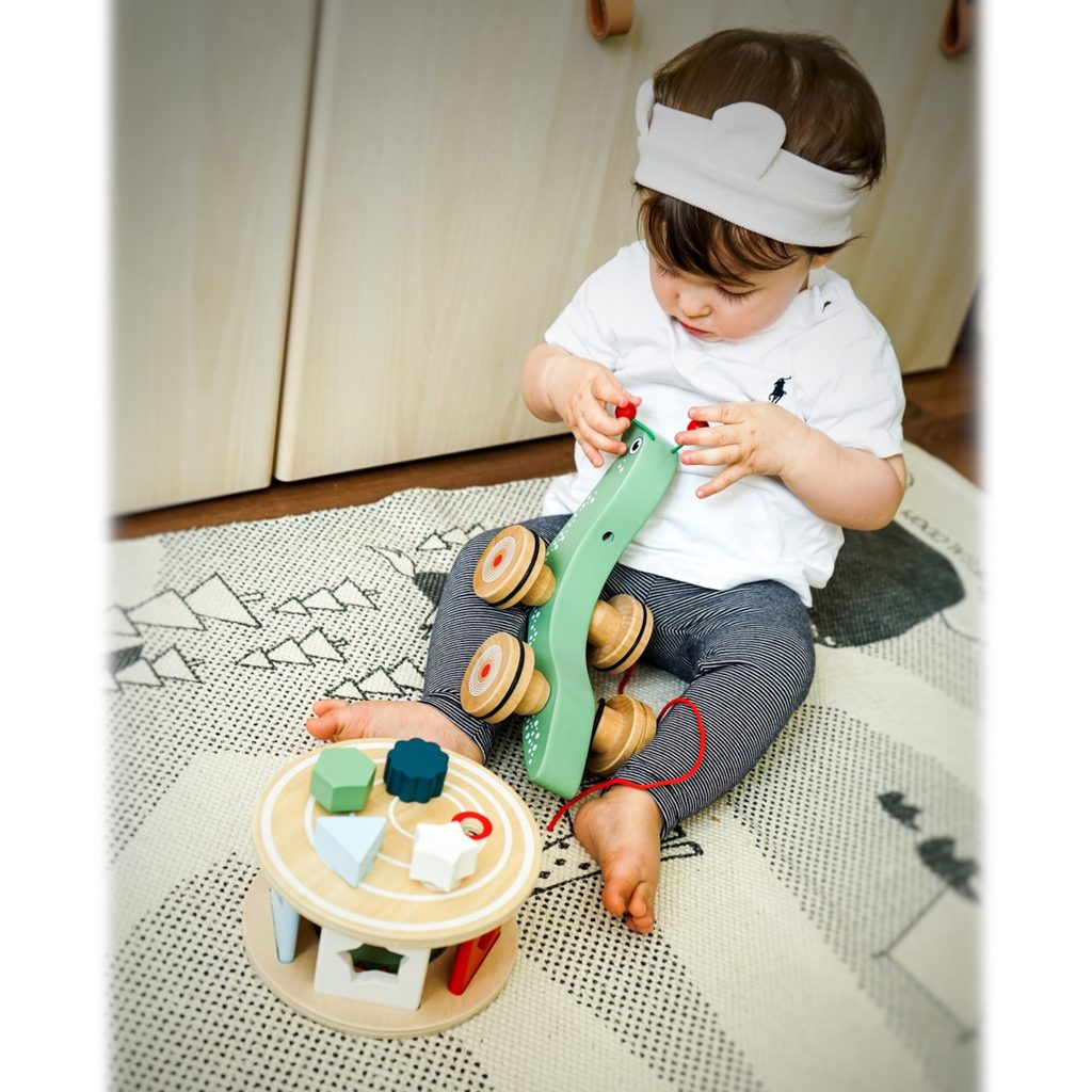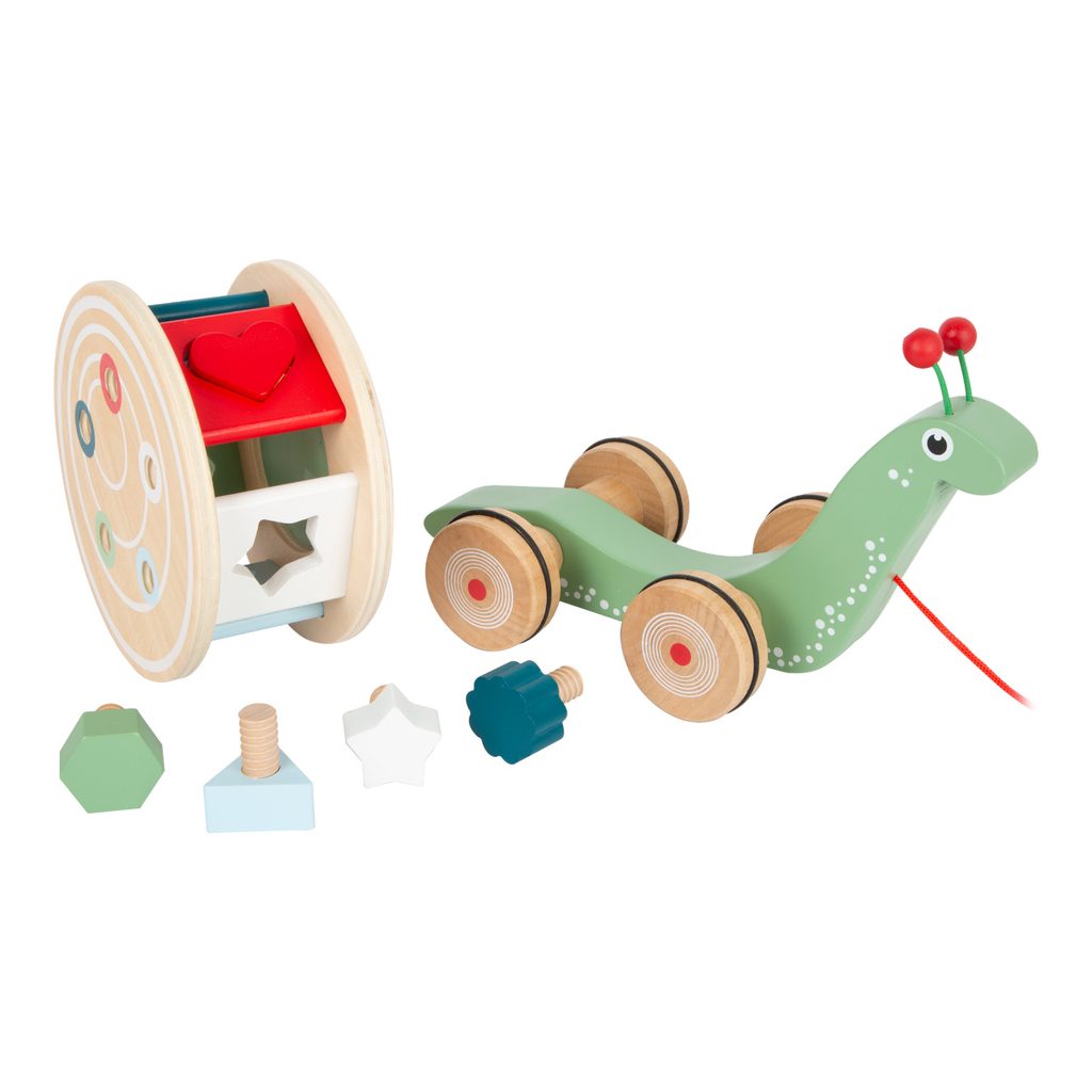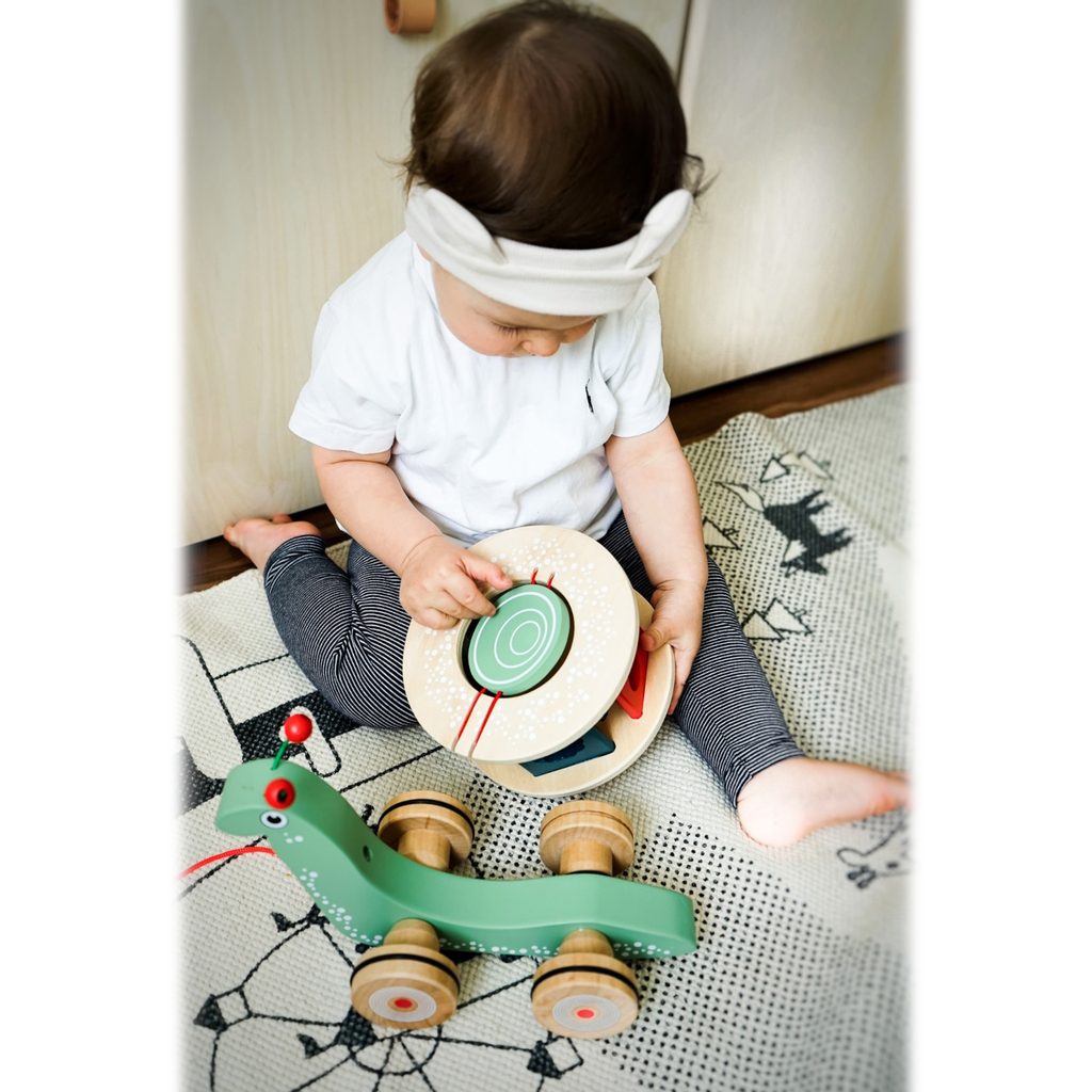 Tato dřevěná tahací hračka s přátelskýma očima, mnoha detaily a pogumovanými kolečky inspiruje děti k prvním krůčkům. Při tahání se šnekova ulita otáčí a dílky uvnitř vydávají zvuk. Dílky můžete pomocí jejich provázků také připevnit na stranu ulity. Hračka je mixem přírodního a barveného dřeva v moderních barvách. Šnekova ulita je oddělitelná a funguje jako vkládačka. Na straně ulity jsou oddělitelná dvířka, kterými můžete dílky z vkládačky opět vyndat. Můžete je také skladovat připevněné na ulitu, aby nevydávaly zvuk. Chytrá motorická hračka perfektní pro děti. Hlavní vlastnosti Tahací motorická a edukativní hračka v jednomOddělitelná ulita může být použita jako vkládačkaPři hře trénuje motoriku dětí různými způsobyPři hře stimuluje sluchový vjem dětíUlita má postranní dvířka, kterými lze jednoduše vyjmout vložené dílkyPogumovaná kolečka zajišťují tichý chod