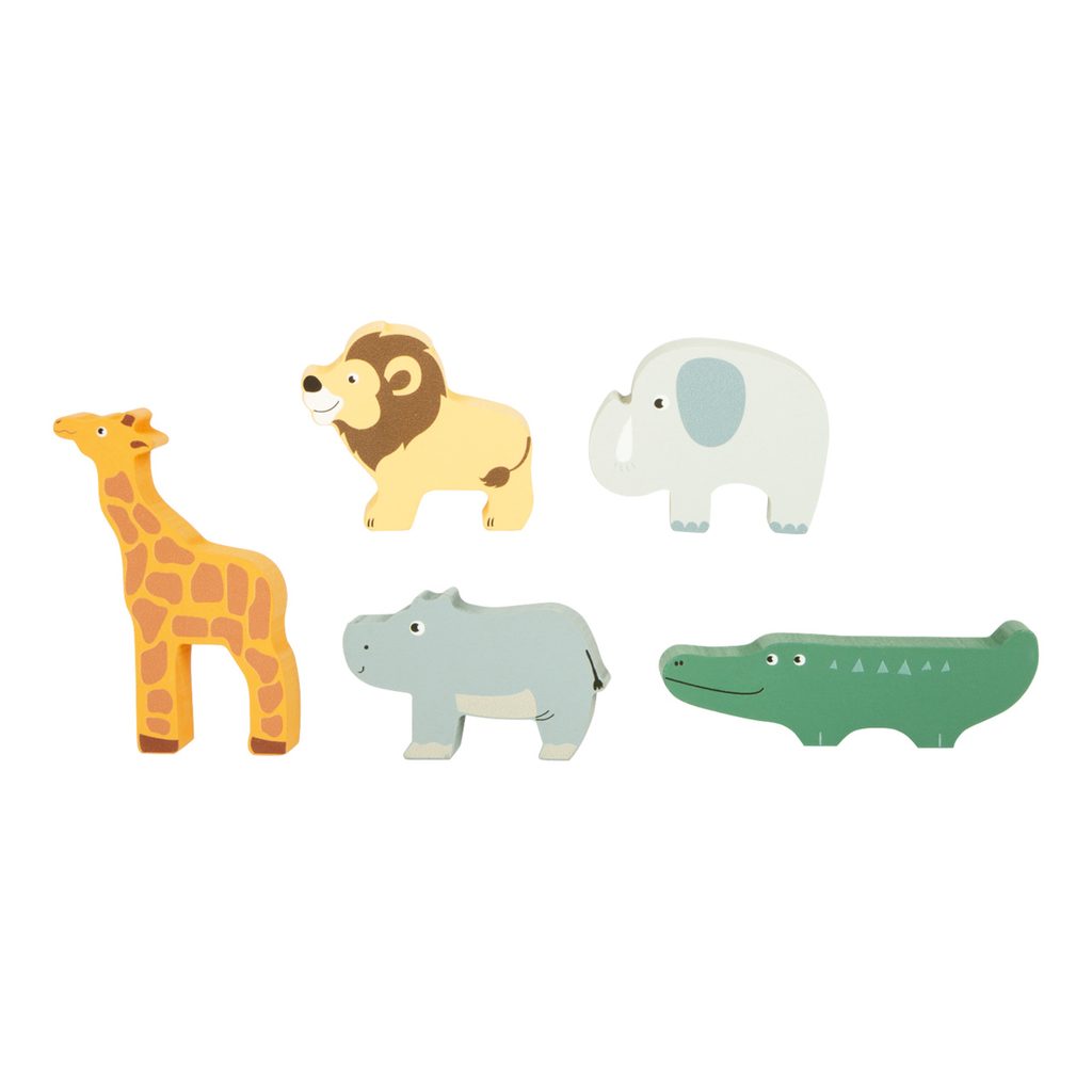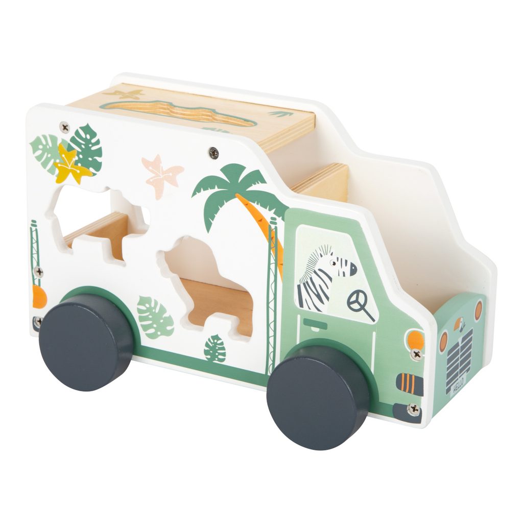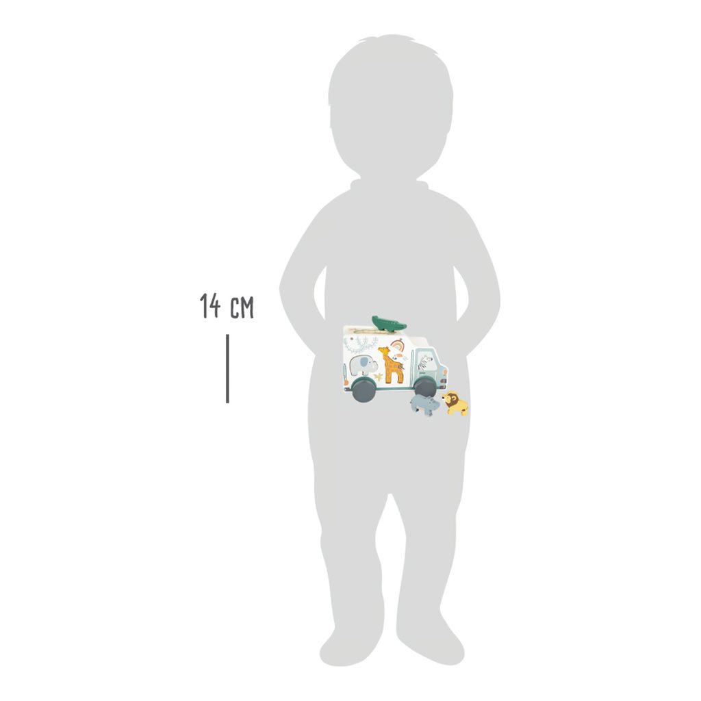 Vkládací hračka a dřevěné autíčko v jednom. Dřevěná vkládačka v populárním safari designu. Žirafa, hroch, lev a jejich kamarádi jsou připraveni na výlet do divočiny se zebrou řidičkou. Safari minibus má pět vkládacích otvorů, pro každé zvíře jeden. Krásná hračka, která trénuje rozpoznávání tvarů a motoriku. Auto má mnoho detailů a dost místa pro roztomilé figurky. Dlouhotrvající zábava v každém dětském pokojíku! Hlavní vlastnosti: ilustrováno, pastelové barvyauto a 5 dílů