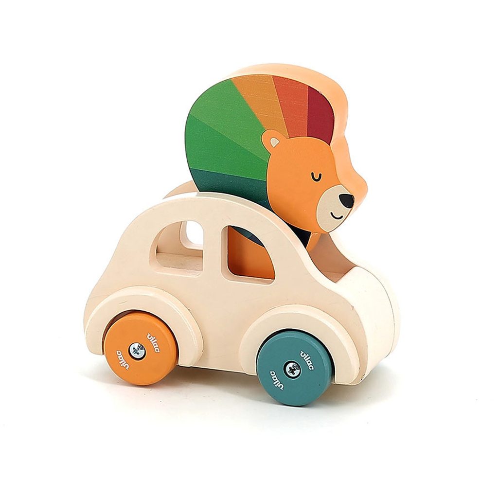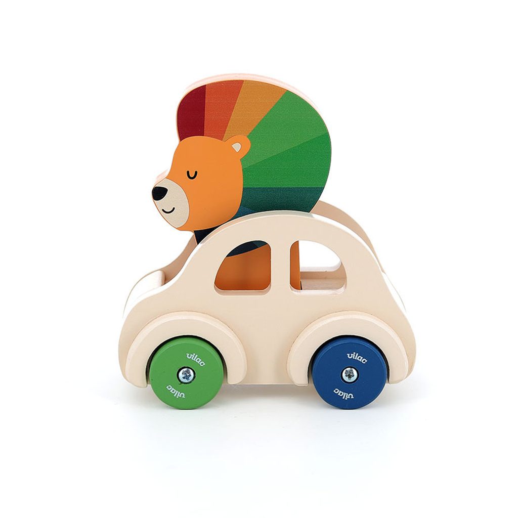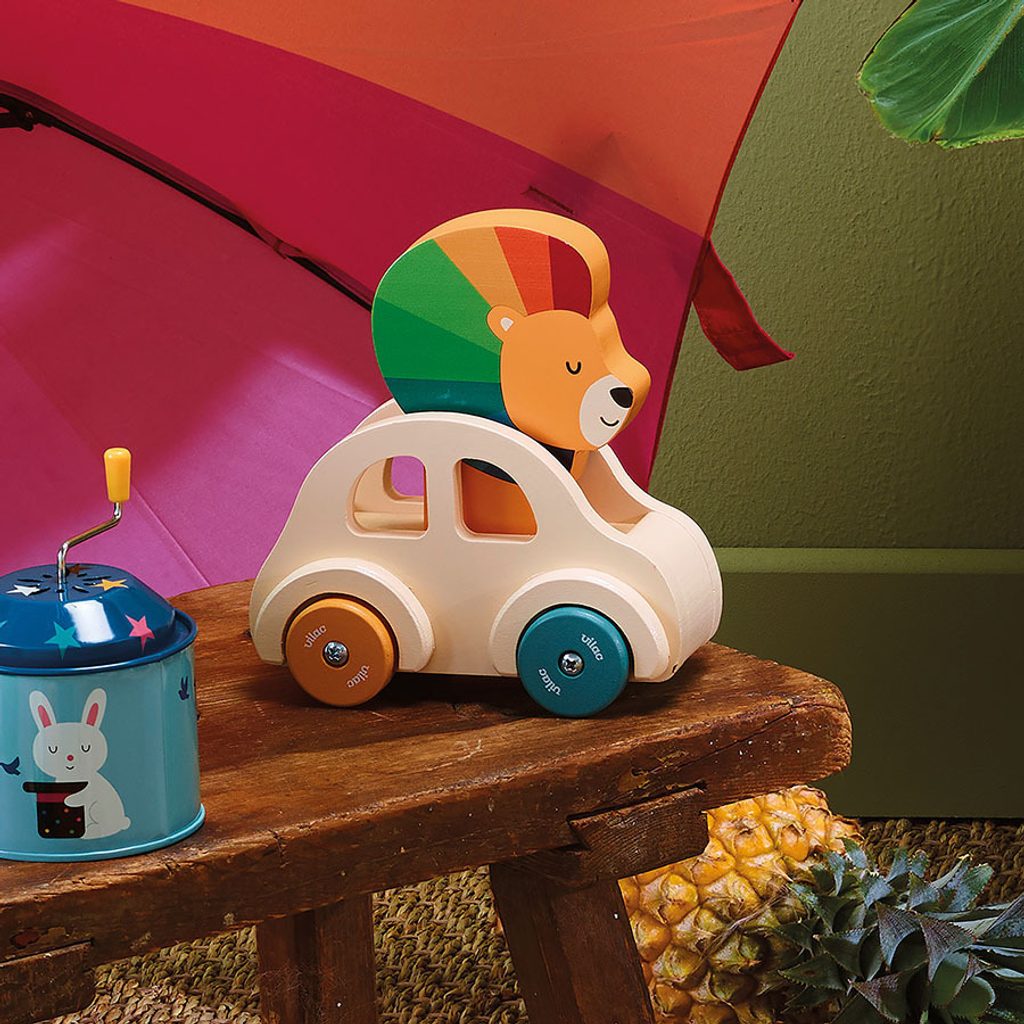 Dřevěné autíčko v přírodní barvě s barevnými koly, ve kterém sedí rozkošný lvíček s barevnou hřívou. Pod lvíčkem je zabudován klakson, proto když dítko zatlačí na hlavu lvíčka, ozve se zatroubení. Tento zvukový detail stimuluje zájem batolat a zároveň jim poskytuje přímou interakci s hračkou. Hračka je dokonale přizpůsobena pro malé ruce a rozvíjí fantazii, jemnou motoriku a koordinaci ruka-oko. Hlavní vlastnosti: ilustrace Andy Westfacehračka s klaksonemrozvíjí jemnou motoriku, objevování a pozorovánípodporuje kreativitu a motivuje k představivé hře Andy Westface je ilustrátor žijící a působící v Hongkongu. Svou prací se snaží zprostředkovat silné pocity a jasné myšlenky za pomoci jednoduchých tvarů, kompozic i barevnosti. Typickými prvky jeho děl jsou zvířata a duha, které si oblíbil pro jejich čistotu, upřímnost a schopnost vzbuzovat radost.
