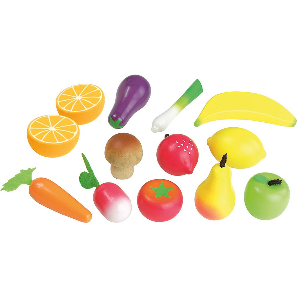 Sada ovoce a zeleniny, s kterou si děti mohou hrát na malé obchodníky na trhu. Pěkná lepenková krabice obsahuje mrkev, citron, ředkvičku, pórek, lilek, žampion, rajče, banán, jablko, hrušku, jahodu a dvě poloviny pomeranče. Ovoce je dřevěné s plstěnými doplňky. Hlavní vlastnosti: vhodné do každé kuchyňkypotraviny vyrobené ze dřevaobsahuje 12 ks