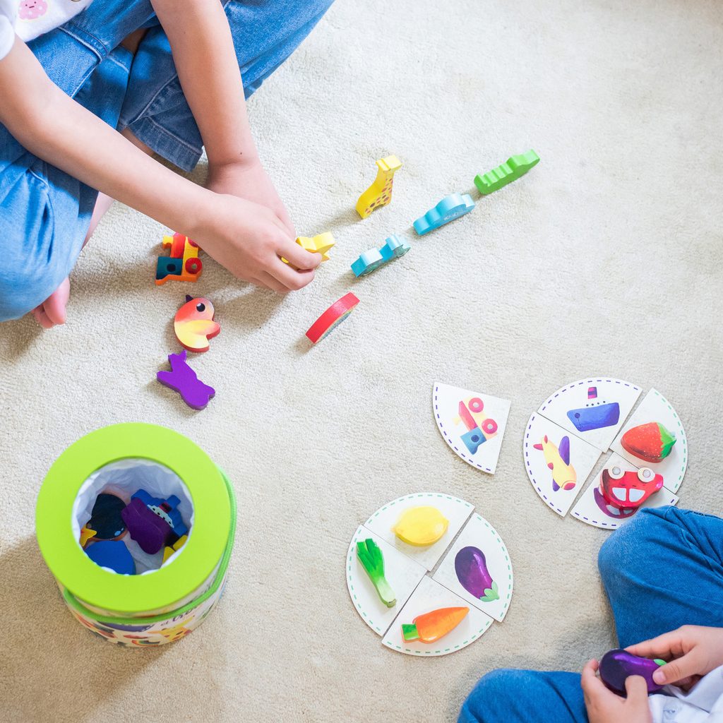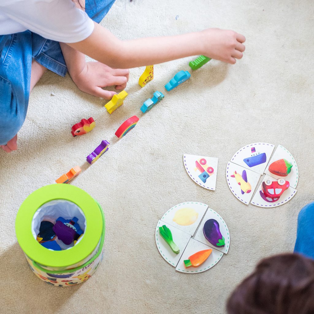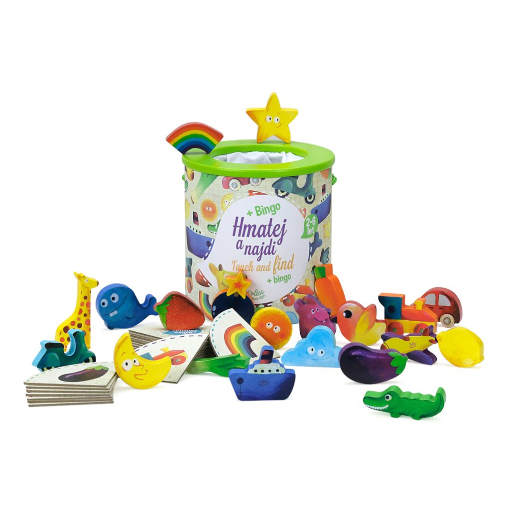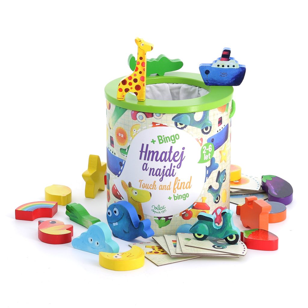 Nepřekonaný bestseller Vilac se originálním způsobem snaží rozvíjet často opomíjený smysl dětí, hmat. Hra je tvořená zejména dřevěnými figurkami ukrytými v kyblíku vybaveném uvnitř jemným látkovým sáčkem. Menší děti mají za úkol po vložení ruky do tuby jen na základě hmatání popsat svými slovy, jaký předmět drží v ruce. Rodiče mohou postup dětem předvést názorným příkladem. Starší děti mohou hrát hru ve formě lota, nebo binga, k těmto hrám jsou v sadě k dispozici obrázkové karty jednotlivých předmětů. Hlavní vlastnosti: 21 herních dílků a 20 obrázkových karetpro 2–5 hráčůrůzné herní variantypraktické balení Návod ke hře: Hmatej a najdi:První hráč si vezme kartu z hromádky. Poté musí sáhnout do sáčku a podle hmatu najít dřevěný dílek, který odpovídá obrázku na kartě. Pokud vybere správný dílek, kartu si ponechá a na řadě je další hráč, který opět začíná tažením karty z hromádky. Pokud ale první hráč vybere nesprávný dílek, musí svou kartu předat dalšímu hráči, který se musí pokusit najít správný dílek. Po každém kole se dílky vrací zpět do sáčku. Když už na hromádce nezbývá žádná karta, určí se vítěz. Vítězí hráč s největším počtem karet. Pozor! Pokud jeden z hráčů náhodou vytáhne dílek ve tvaru bomby, musí všechny své karty vrátit na hromádku! Pravidla můžete upravit dle vlastního uvážení, aby se děti lépe seznámily s hmatáním a hledáním předmětů: 1 – Začněte s malým množstvím dřevěných dílků.2 – Dovolte dětem podívat se do sáčku.3 – Poté hru opět udělejte o něco těžší, nedovolte jim nahlížet do sáčku.4 – Přidejte do sáčku více dílků.5 – Nakonec, až si děti na hru zvyknou, hrajte podle tradičních pravidel. BINGO varianta:Rozložte 4 karty do čtverce a vytvořte jedno, nebo více hracích polí pro každého hráče. Jeden z hráčů, nebo rodič vytáhne dílek ze sáčku a vyvolá ho. Hráč, který má kartu odpovídající tomuto vyvolanému dílku, si jej vezme a položí na svou kartičku. Vítězí hráč, který jako první zaplní své herní pole! Dokumentace: Návod ke hře Hmatej a najdi (CZ)Návod ke hře Hmatej a najdi (SK)