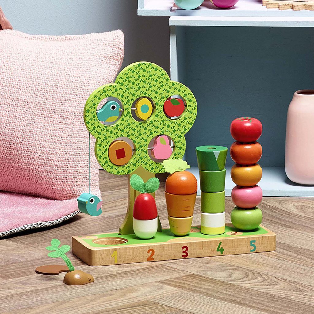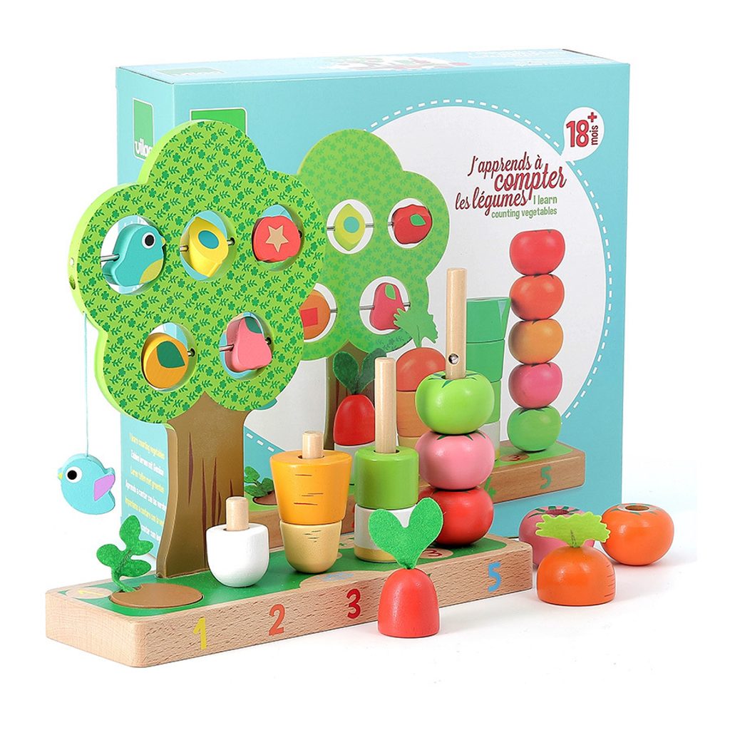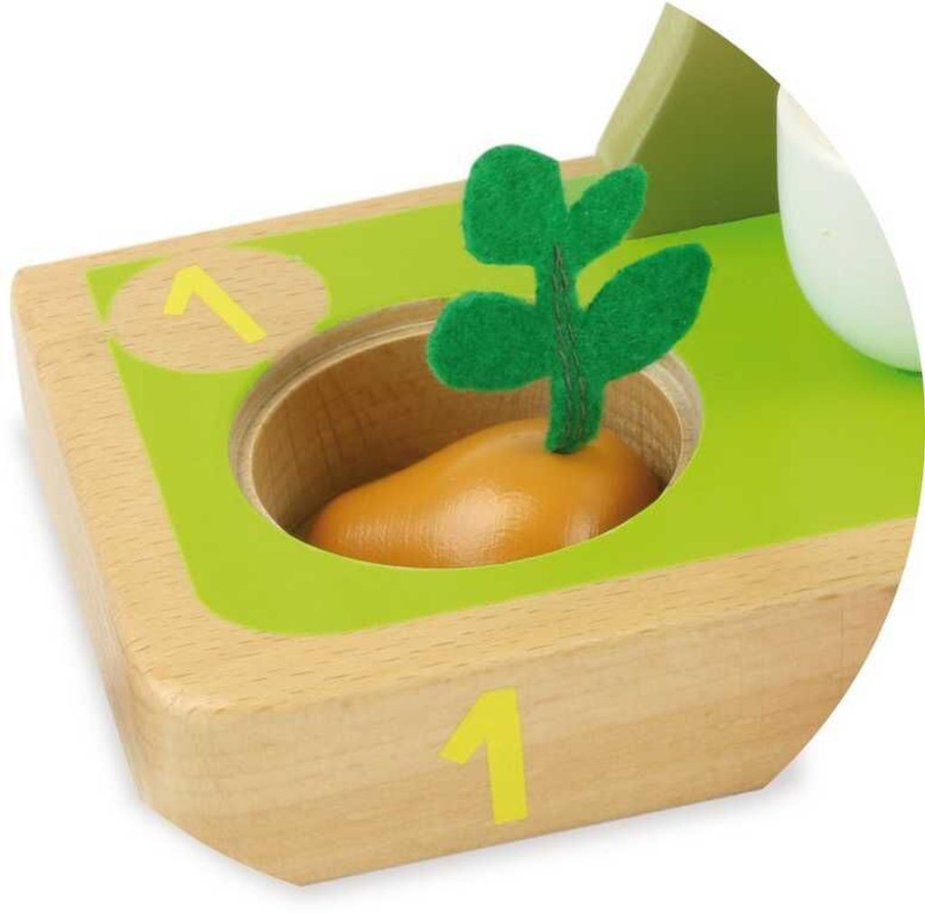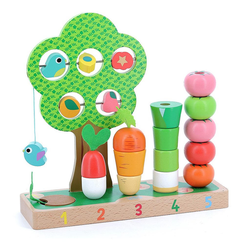 Hra, která probudí smysly dětí je ideální k učení počítání a rozeznávání tvarů. Tato dřevěná hračka se skládá ze základní desky, zeleniny a stromu s otočnými dílky. Zelenina obsahuje například mrkev, pórek a rajčata. Zeleninu a její dílky děti navlékají na dřevěné tyče. Nejvyšší z tyčí je upevněna na provázku, v případě pádu dítěte na ní, se tyč odkloní. Hračka je certifikovaná pro věk 1,5+. Hlavní vlastnosti: bezpečná a zábavná hračkarozvíjí logické myšlení a motoriku dítěte krásný design, jemné barvy upoutají pozornost dítěte